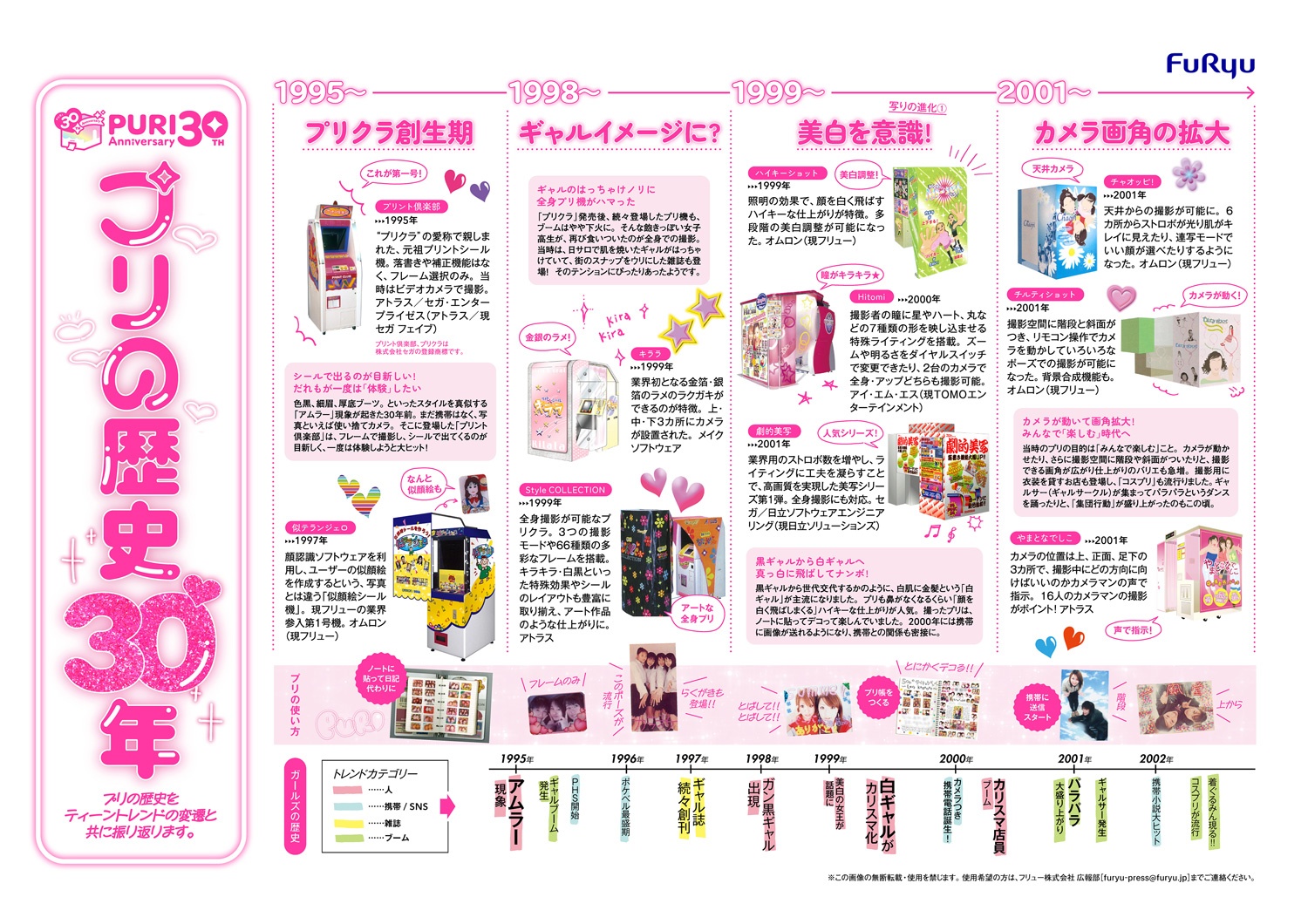 平成から令和までティーントレンドと共に歩み、若者の青春の瞬間を作り続けてきたプリントシール機。2025年7月25日(金)に公開された資料「プリの歴史30年」では、プリントシール機の移り変わりやティーントレンドとの関わり合いが文章と写真で紹介されています。(※画像は一例、公開ページはこちら)
