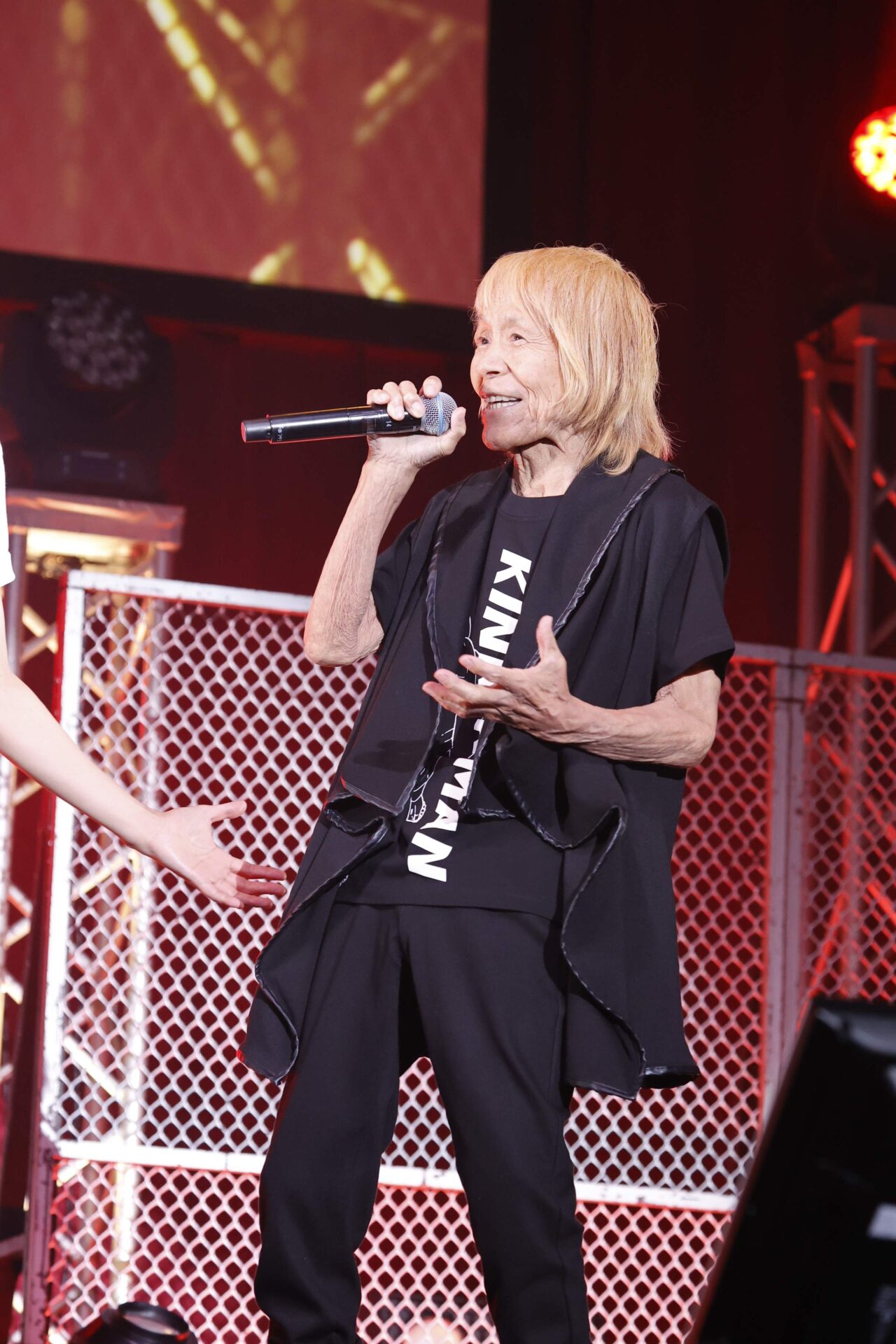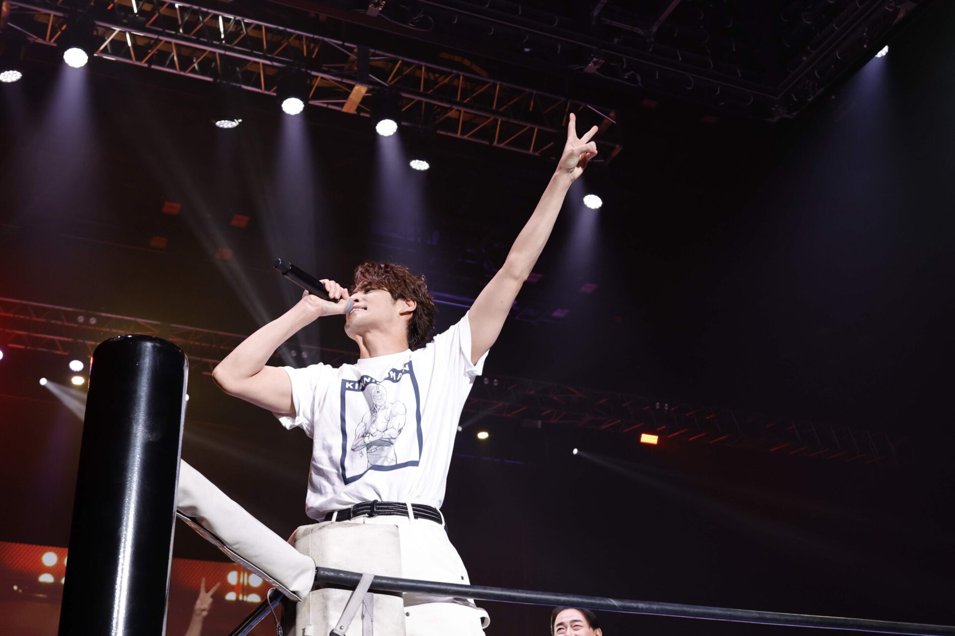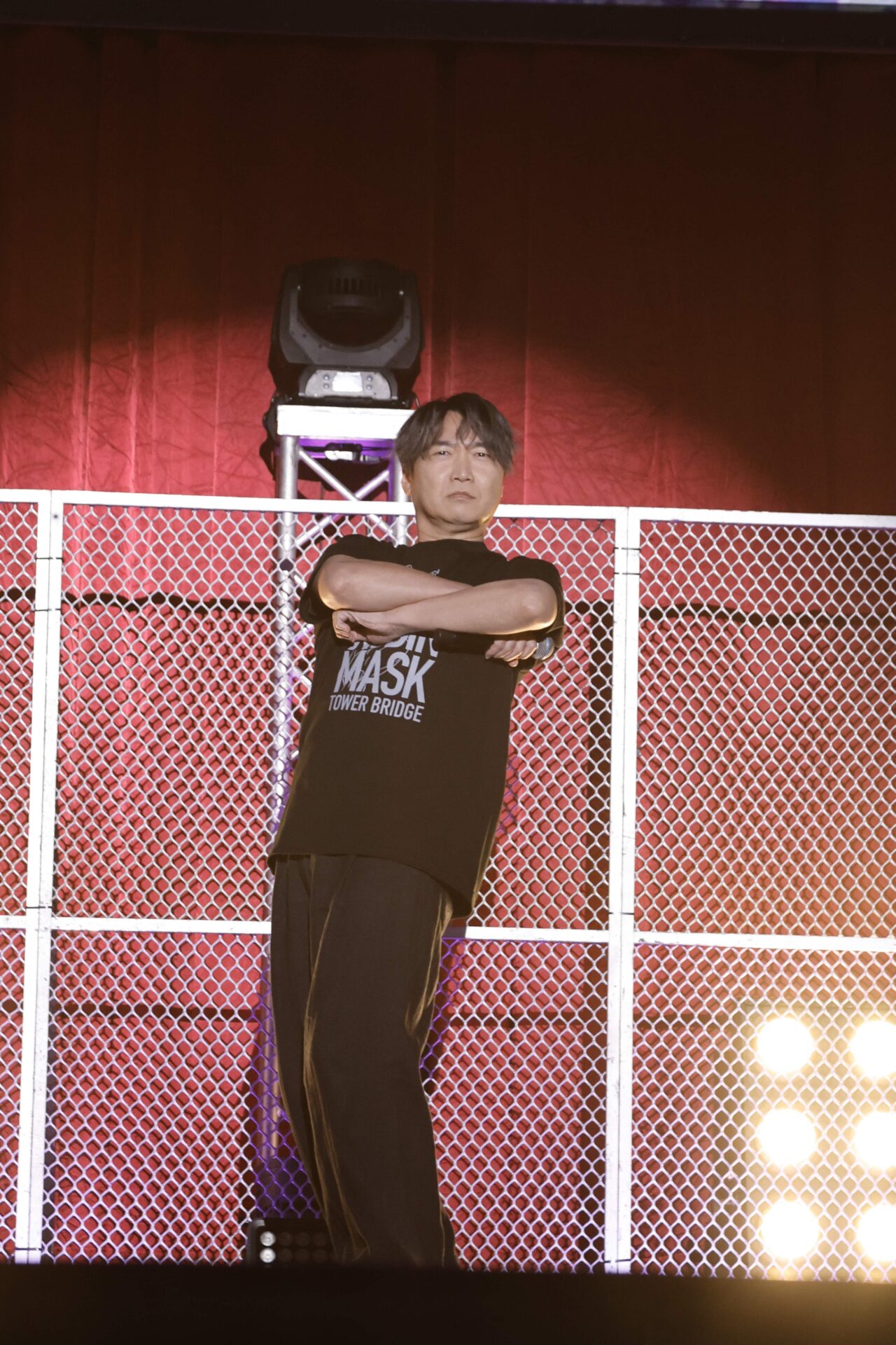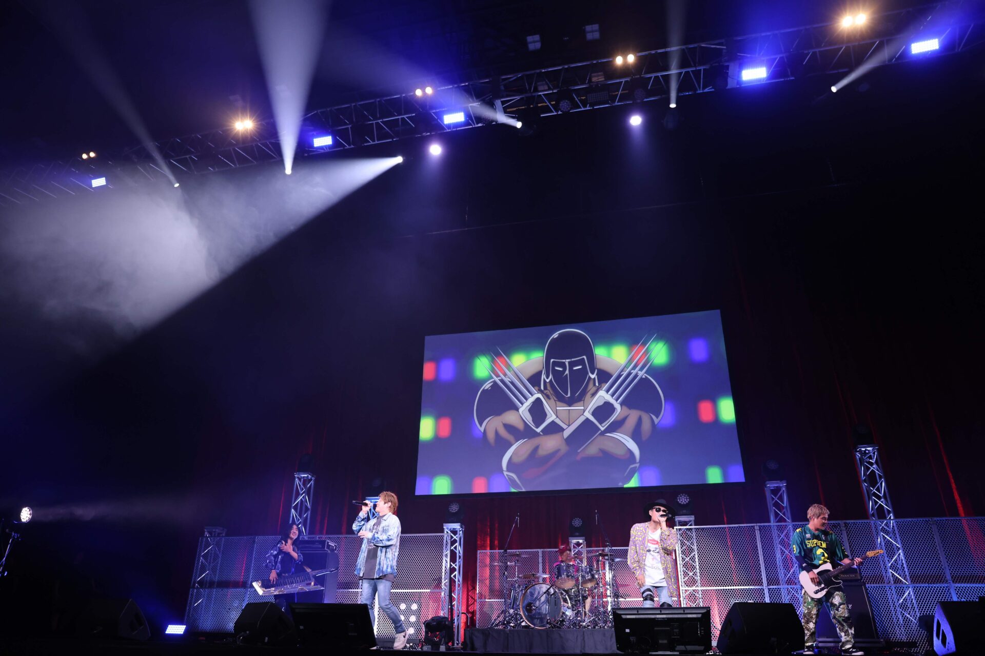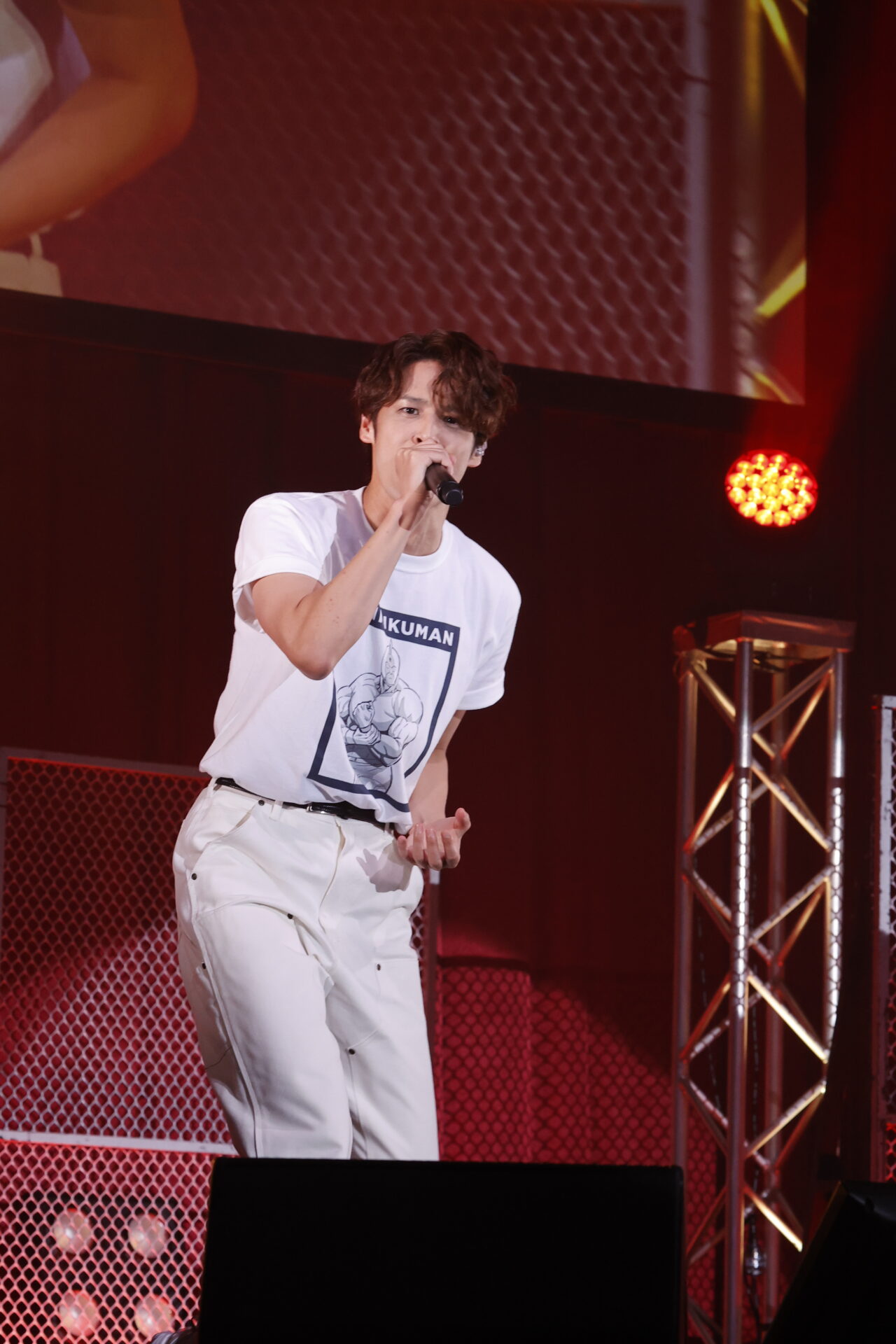 再び全員がリングに移動してのゲームコーナーと肉友から届いたメッセージの紹介をはさんで、イベント後半は豪華アーティストが出演するライブコーナーへと突入。まずはトップバッターの高梨康治×FLOWがSeason 1 オープニングテーマ「LOVE & JUSTICE」、続いて遠藤正明さんがSeason 2 オープニングテーマ「キン肉マン英雄」で会場を盛り上げる。そして、最後のアーティストが登場する際に、この日一番のサプライズが待っていた。モニターで紹介されるアーティスト名の「キン肉マン(CV:宮野真守)」の後に出てきた「AND」の文字に、ざわつき始める会場。そのざわめきは「AND」に続く「串田アキラ」の名前が浮かび上がってきた瞬間、大歓声へと変わった。そう、「キン肉マン」シリーズで数々の名曲を歌ってきた伝説のアニソンシンガー・串田アキラさんがシークレットゲストとして降臨したのだ。宮野さんと2人で歌う曲は、もちろん「キン肉マンGo Fight!」。闘病生活を乗り越え、今なおステージでパワフルな歌声を聴かせてくれる串田さんの姿はまさに超人のごとく、客席には涙を流しながら聴いていた人も決して少なくなかっただろう。宮野さんも「ご一緒に歌わせていただけるとは思ってもいませんでした」と感動していた様子で、串田さんは「皆さんが一緒に歌ってくれてよかった!」と喜びの声を上げていた。