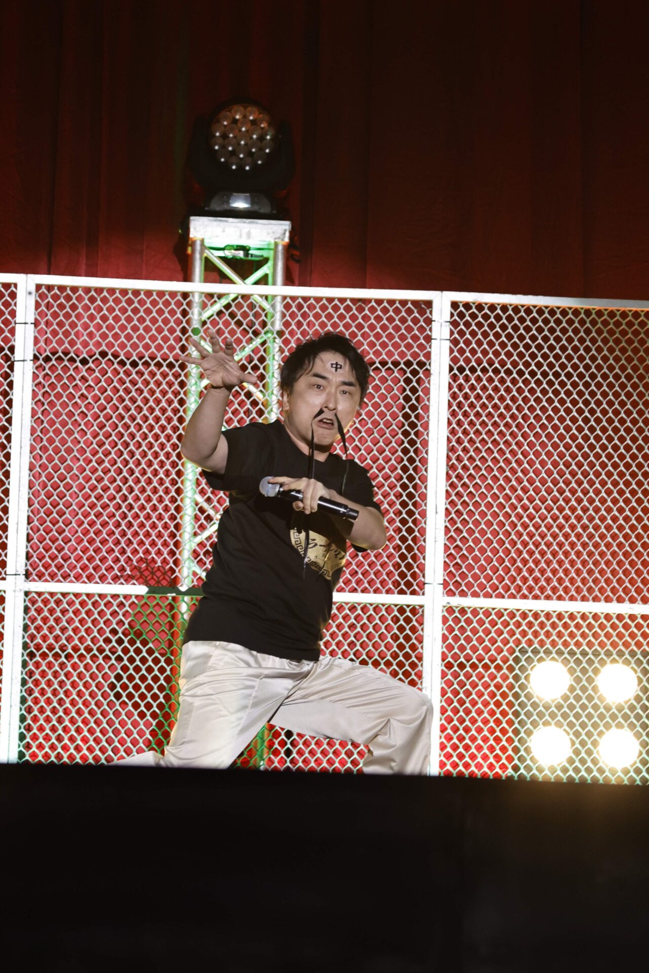 大勢の肉友(「キン肉マン」ファン)が詰めかけた会場にはメインステージのほかに中央にはプロレスのリングが設置され、まるで血沸き肉躍る戦いがこれから始まるかのような様相を呈していた。はたしてどんなイベントが繰り広げられるのか? いやが上にも肉友たちの期待が高まるなか開演時間となり、まずはMCを務めるお笑い芸人「なすなかにし」の中西茂樹さんと「『キン肉マン』完璧超人始祖編」アナウンサー役・太田真一郎さんの2人がリングイン。中西さんは「キン肉マン」大好き芸人としてこれまでもキン肉マン「超人ラジオ」等にも登場いただいたことがあり、「今日は皆さん、女房を質に入れて見に来たんですか?」「もしも声優の皆さんがちょっと疲れてきたんちゃうか? と思ったら、座席をLの陣形にしてください」とマニアックなネタで笑いを取りつつ、実際に格闘技のリングアナウンサーを務める太田さんの呼び込みで超人声優たちが登場する。この日のイベントに参加したのはキン肉マン役・宮野真守さん、テリーマン役・小野大輔さん、ロビンマスク役・小西克幸さん、ラーメンマン役・関 智一さん、ブロッケンJr.役・笠間 淳さん、ジェロニモ役・小野賢章さん、バッファローマン役・安元洋貴さんの総勢7名。これだけ豪華なメンバーであれば登場するだけでも会場は大いに盛り上がるが、各々がカメラに向かってアピールしたり、リングインする前にリングの周りを一周してパフォーマンスしたり、超人の必殺技や決めポーズを再現したり、オープニングパートだけでも会場を盛り上げた。関さんに至ってはラーメンマンのトレードマークである長いヒゲや額に「中」の文字を付けての登場となっていた。