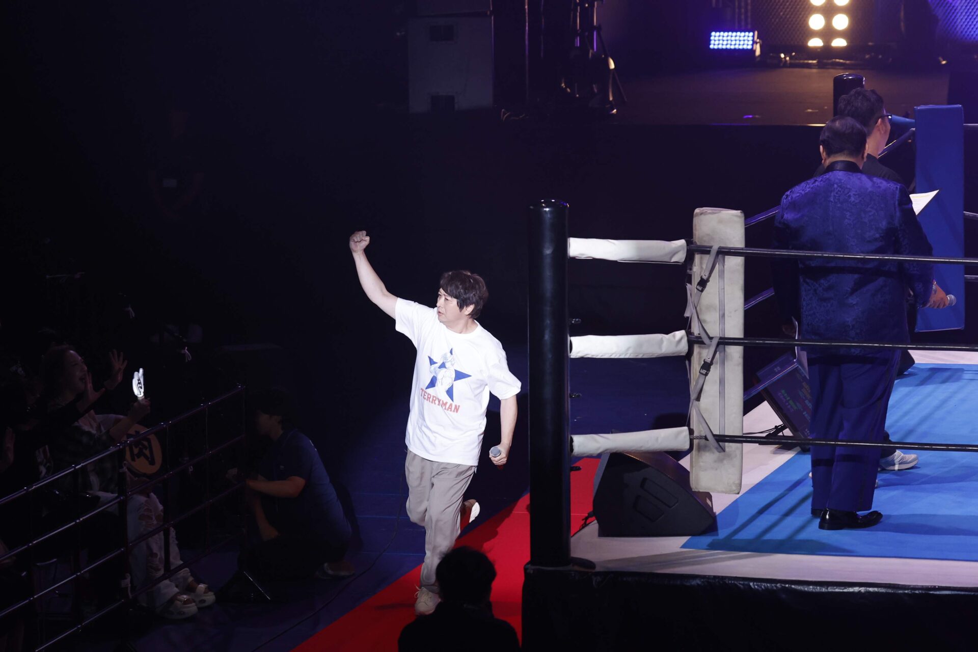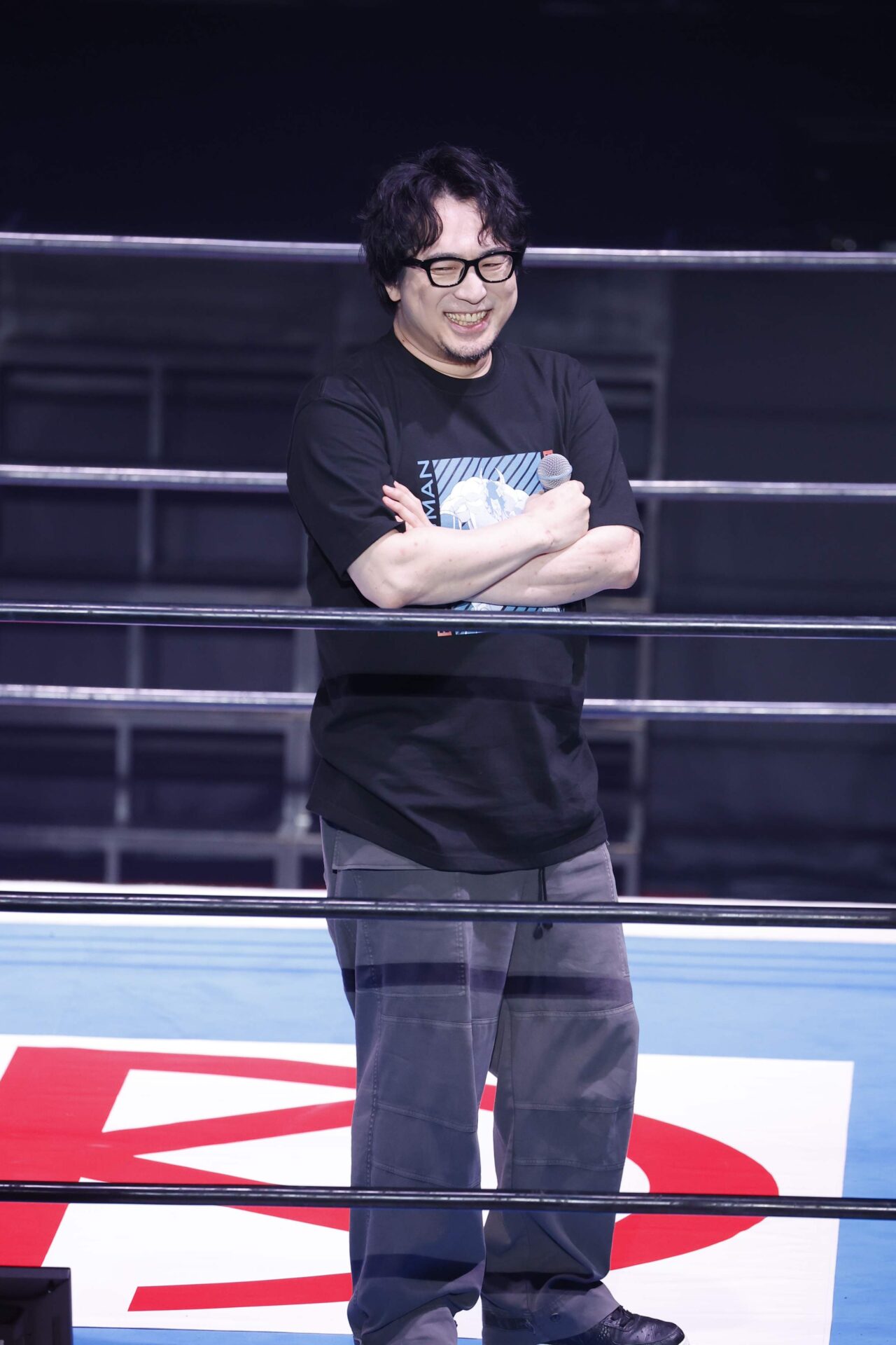 7人がリング上に揃ったところで、改めて太田さんが各超人の煽り文句を織り交ぜながら超人声優たちの名前をコールしていく。“本物”の発するコールだけに「太田さんにコールしてもらうの気持ちいい」とそれぞれご満悦の様子だったが、全員の紹介が終わったところですでに開演から30分を超えており、イベントのオープニングとしては異例の長さ。そんなオープニングを締めくくってイベント本編をスタートさせるべく中西さんが「宮野さんに掛け声をお願いしたいと思います。『キン肉マン』といえば!! の、あのセリフを言っていただいて……」と振ると、宮野さんは気持ちよさそうに「♪牛丼一筋~」と歌い出す。絶好調のボケで一笑いをさらった後は、しっかり「へのつっぱりはいらんですよ!!」とかっこよく決めて、いよいよ超人祭のスタートとなった。