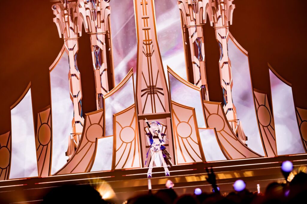 伝説の一夜、その幕開けを彩ったのは、Giga&TeddyLoidのタッグが手掛けたハードなアップチューン「Knock it out!」。通常衣装で登場したかなただったが、間奏中ピストルで上空を撃ち抜くと、カラーライズ衣装へ切り替え。ステージセットにも変化があり、上部から天界の扉が降りてきたかと思えば、巨大な白い翼を広げた。ひらひらと羽が舞い落ちる幻想的なステージで、かなたは挨拶代わりとばかりに、見事なロングトーンを響かせた。