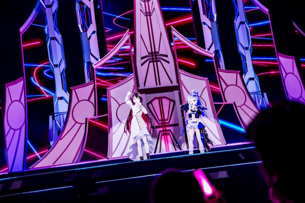 ここからはゲストパート。各楽曲の公式ペンライトカラーは事前に指定されていたが、かなたは「みなさん、サイリウムをピンクにしてください!」とリクエスト。ほぼ反射的にへい民が色を替えると、それに呼ばれたようにAZKiが登場した。2人はまず、ホロライブ楽曲から「至上主義アドトラック」をデュエット。硬質なかなたの歌声とやわらかいAZKiの歌声による極上のハーモニーはもちろん、間奏では2人が「わあ~!」と歓喜の声を上げながらステージを小走りで回る微笑ましい一幕があったことも書き残しておきたい。