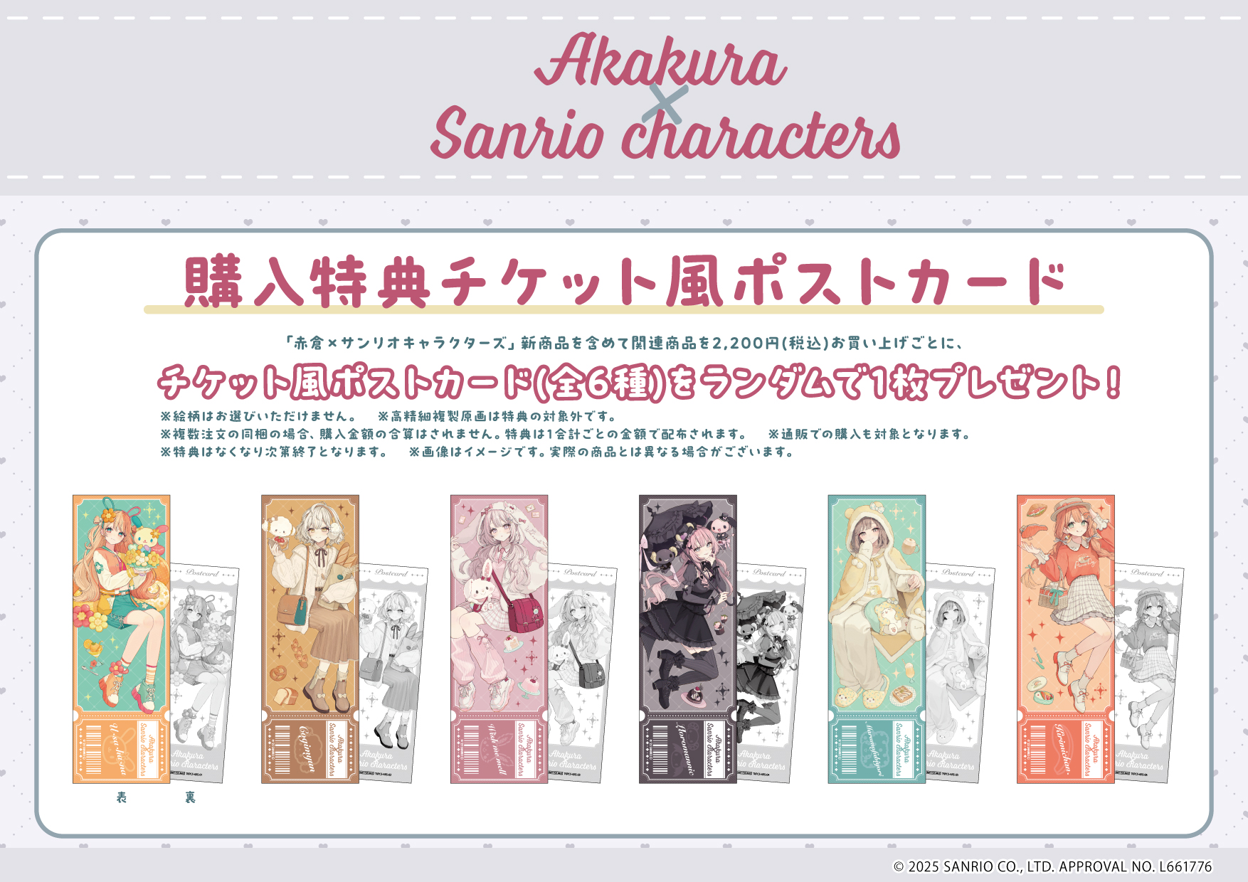 「赤倉×サンリオキャラクターズ」新商品を含めて関連商品を1会計2,200円(税込)お買い上げごとに、購入特典としてチケット風ポストカード(全6種)をランダムで1枚プレゼント。