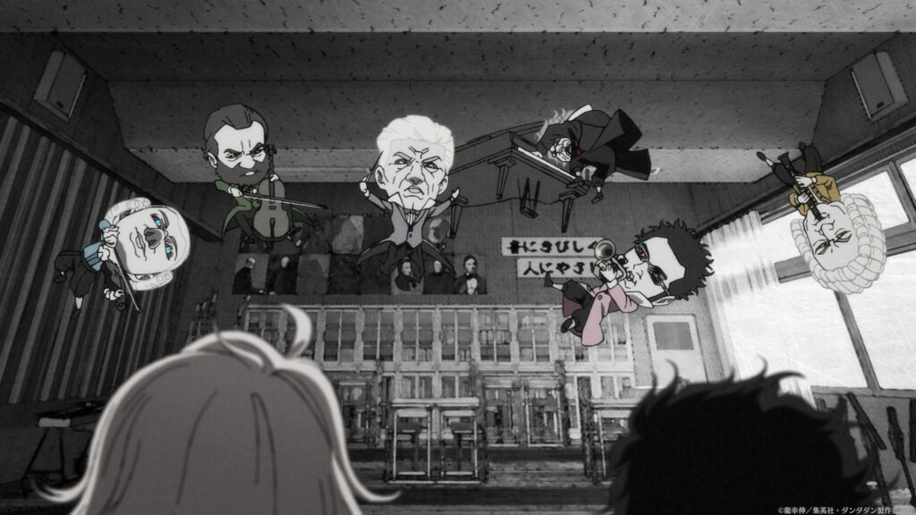 修行のため、学校の音楽室に潜んでいたクラシックの作曲家たちと戦うことになったオカルンとアイラ。徐々にコツをつかむアイラに反して、音符爆弾を飛ばす作曲家たちの攻撃をよけることができないオカルン。そんなオカルンにターボババアは、リズム感で体を動かしてみろとアドバイスをする。