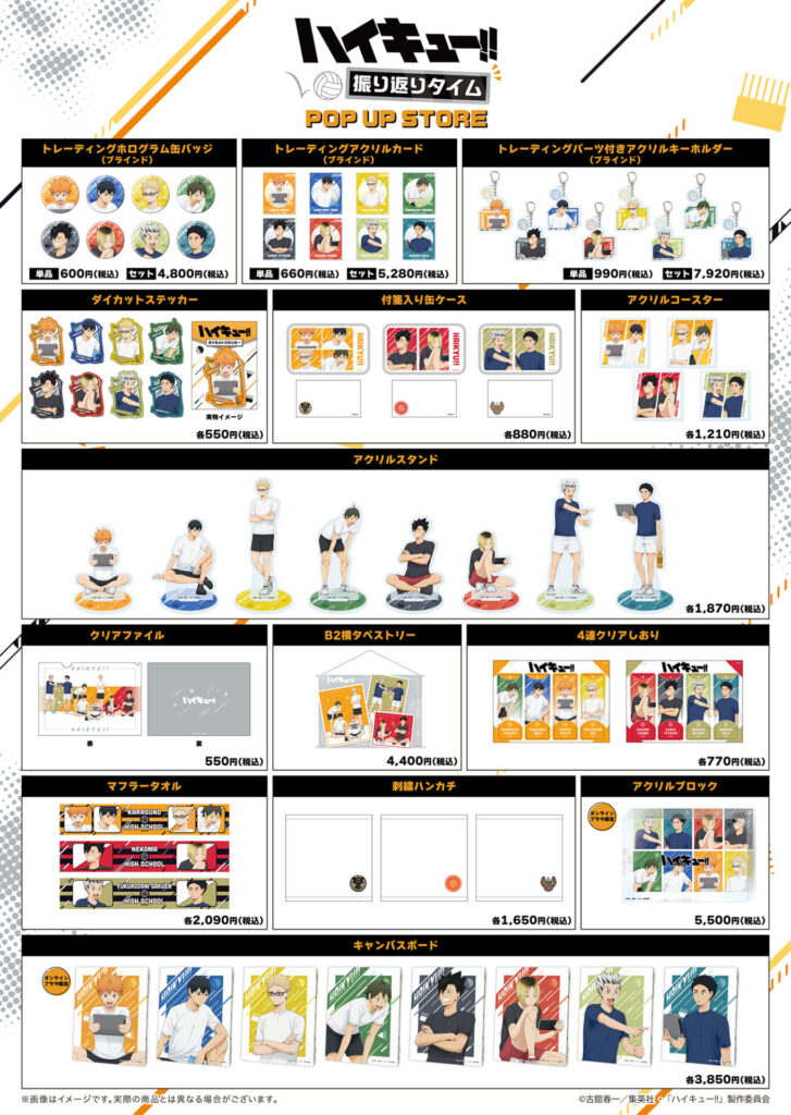 「『ハイキュー!! 振り返りタイム』POP UP STORE in 東京キャラクターストリート いちばんプラザ」では、日向翔陽や影山飛雄たち8名の人気キャラクターの描き下ろしビジュアルを使用した新作グッズが多数登場。
