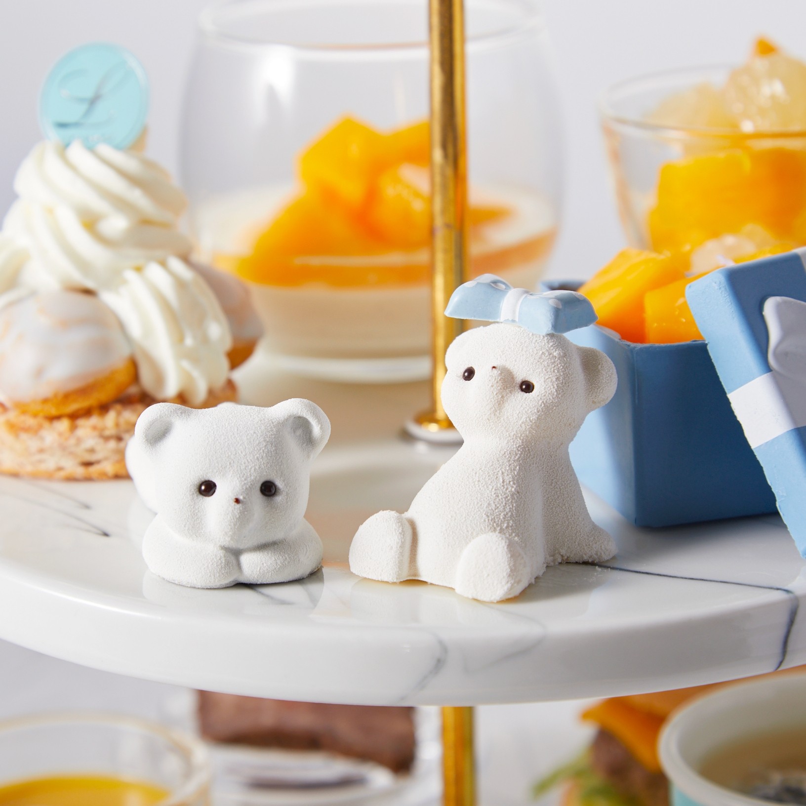 純白に変身したテディベア“ヌーミー”と“エイミー”が彩る、ブルーをテーマにした優雅なアフタヌーンティーです。