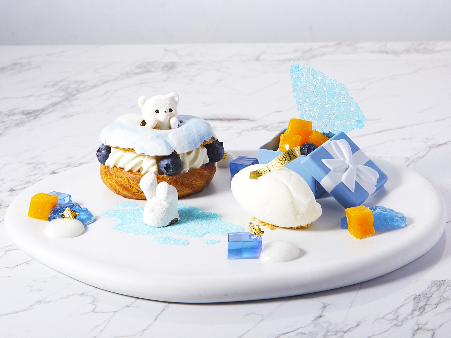 パリ・ブレストを主役に据えたデザートプレートは、ブルーベリーソースの深い甘みと酸味が織りなす味わいを、軽やかなクリームと香ばしいシュー生地が引き立てます。プレート上には、南国の陽射しを思わせるマンゴーと涼やかなソルベ、そしてバタフライピーの青が美しいゼリーが並べられ、まるで絵画のような色彩美を表現! パリ・ブレストから飛び出す純白のテディベア“ヌーミー”が愛らしい逸品です。