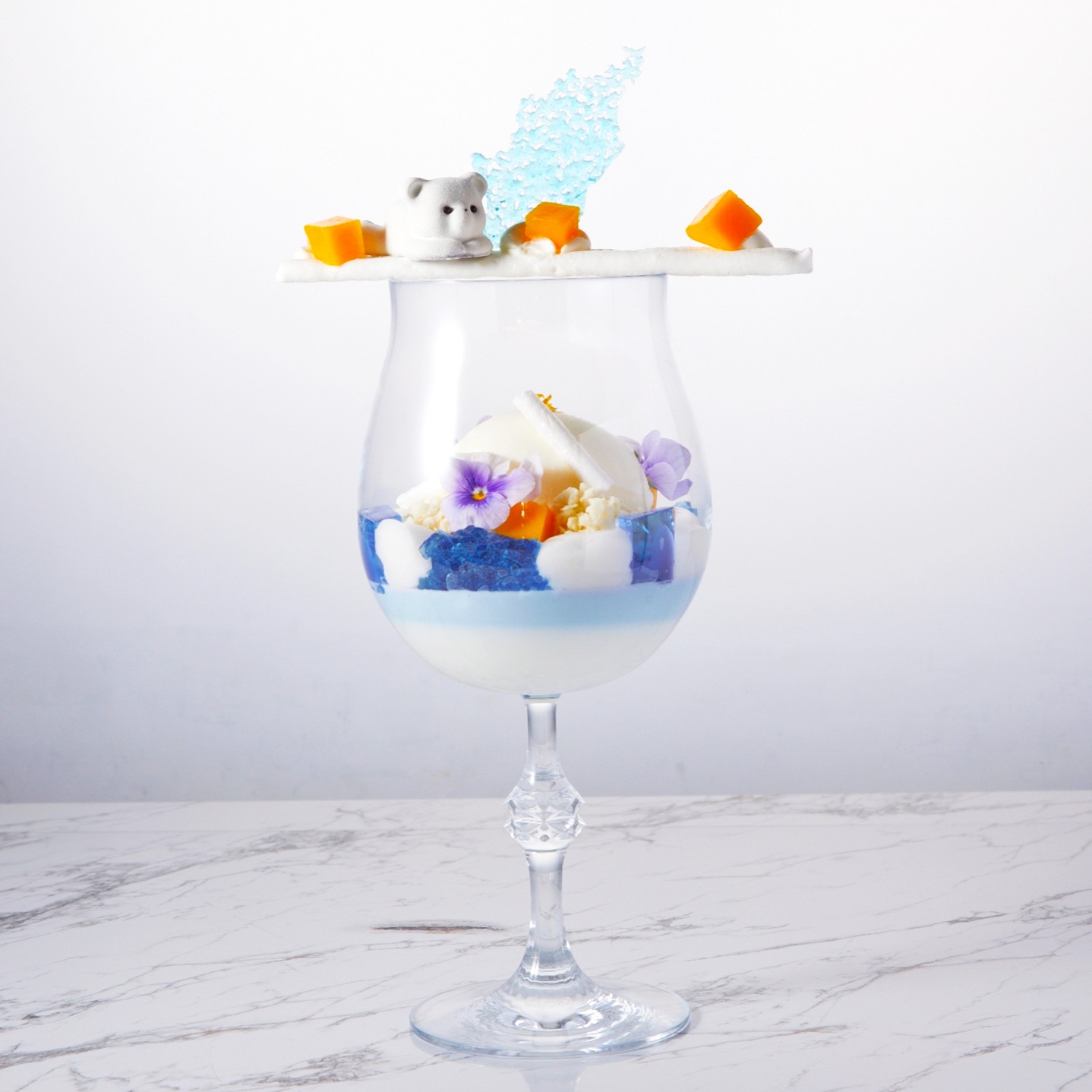 バカラグラスに仕上げた贅沢なブルーパルフェ。ヨーグルトムース、バタフライピーのブルーパンナコッタとジュレ、爽やかなレモンを重ね、ホワイトチョコやスポンジ、季節のフルーツで華やかに仕上げられています。青と白のコントラストが織りなす、まるで宝石箱のようなパルフェは、口に運ぶたびに異なる食感と香りが重なり、至福の時間になること間違いなし。