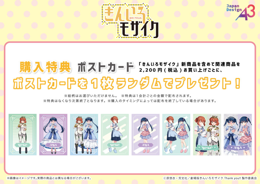 コトブキヤ秋葉原館で、『きんいろモザイク』の新作グッズを含む関連商品を2,200円(税込)お買い上げごとに、ポストカード(全8種)をランダムで1枚プレゼントします。