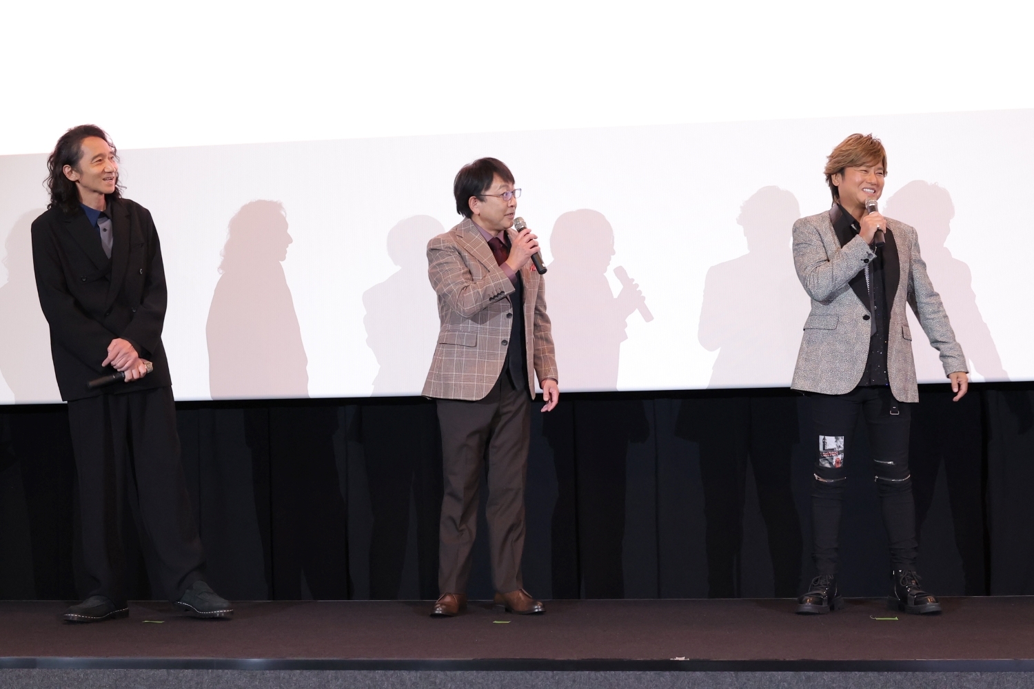 さらに続けて氷室 聖役の関 俊彦は「プリズムの煌めきを、あなたに! 今日は楽しんでください、バーン!」と銃を撃つポーズを交え、黒川 冷役の森久保祥太郎は「今日は皆様にお伝えしたいことがあります…1、2、3、Cool!」とそれぞれ演じるキャラクターならではの挨拶が続き、客席はいきなり最高潮に。菱田正和総監督も「今日は朝に届いたばかりの三強Tシャツを着てまいりました!」と舞台挨拶への意気込みを語り、舞台挨拶がスタートします。