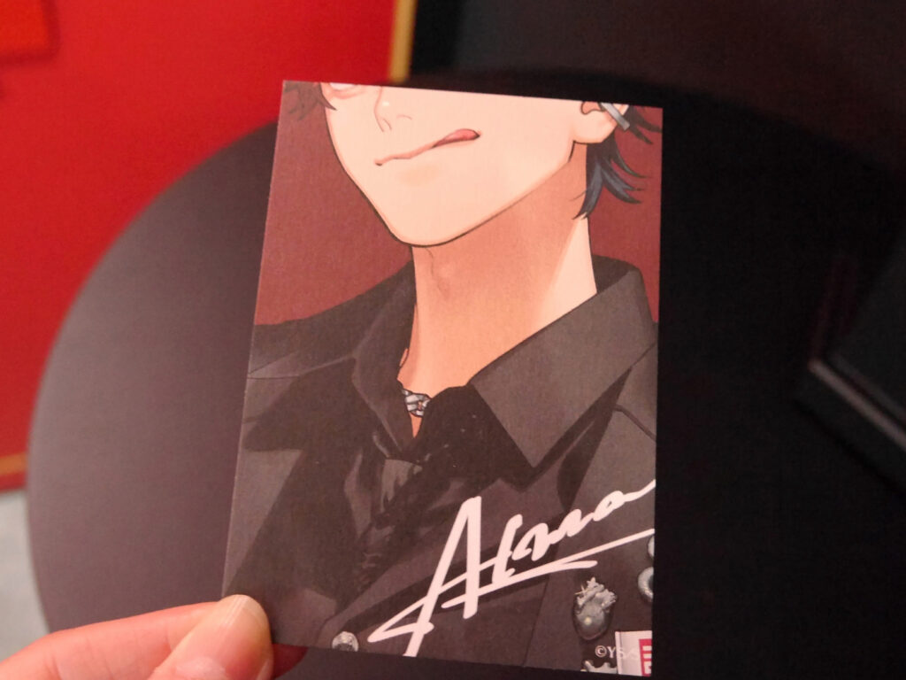 カードには、今回のポップアップショップのために描き下ろされたキャラクターたち(アルマ・タオ・辰臣・ネイ・黄泉・夜)のイラストのうち1つがデザインされており、そのキャラクターたちからのメッセージが裏に書かれています。