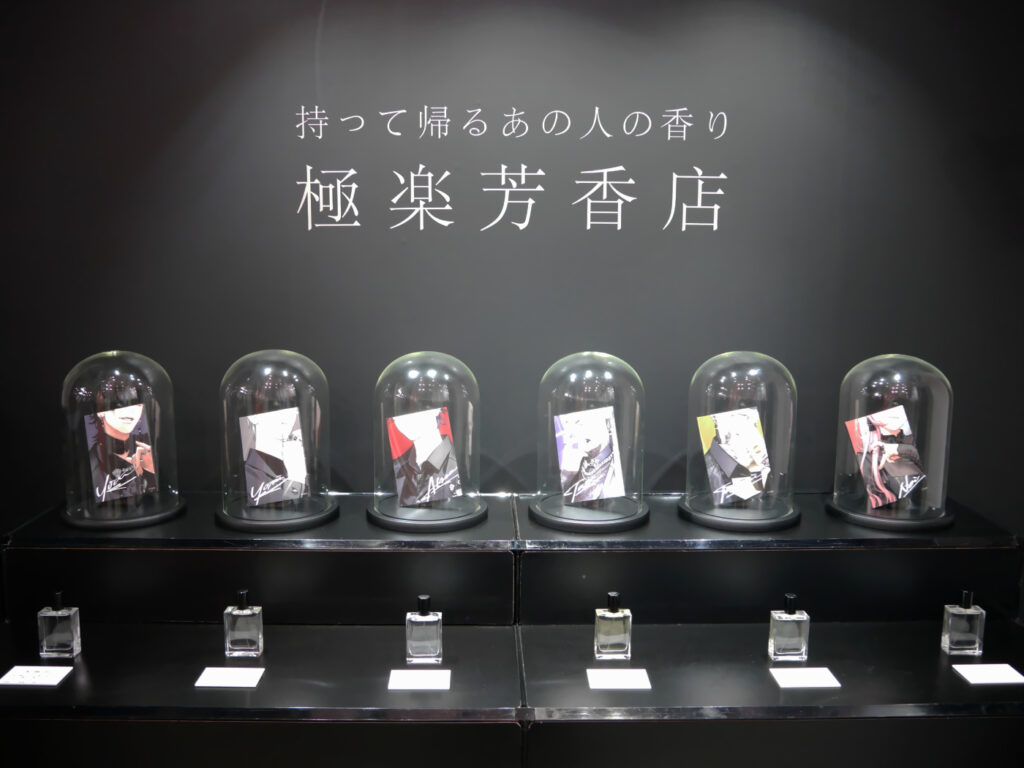 そして、最後にたどり着いたのが「持って帰るあの人の香り 極楽芳香店」と名付けられた一角。後日販売予定の、各キャラクターをイメージした香水が置かれていました。