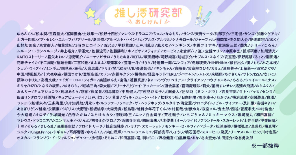 初めての推しを調査したところ、俳優やアイドル、ゲームやアニメのキャラクター、VTuber、歌い手、配信者など、さまざまな推しの名前が挙がりました。