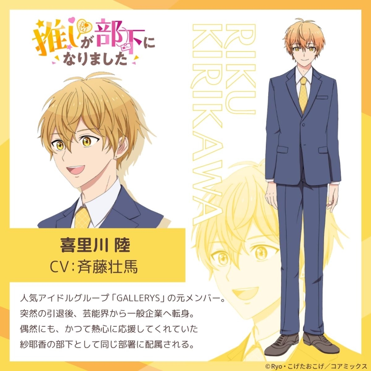 各話 約2分×全30話で展開される本作。元アイドルの新入社員・喜里川 陸役を斉藤壮馬さんが担当することをはじめ、作品概要やキャラクター詳細も一挙に解禁されました。