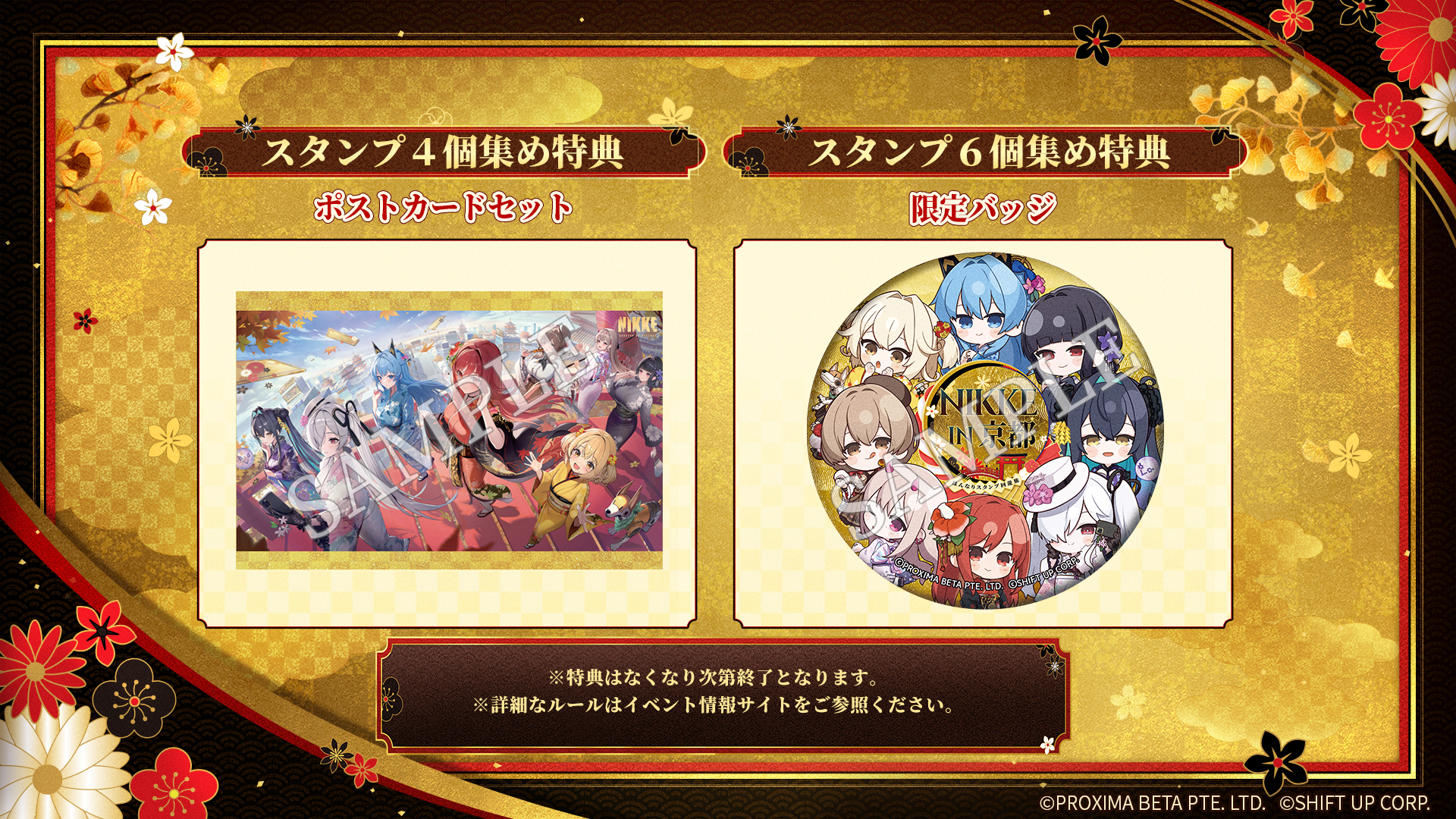 「NIKKE in 京都 はんなりスタンプ回遊旅」ではイベントスポット各所に和装姿に身を包んだキャラクターたちの等身大屏風&等身大立ちパネルが登場するほか、大垣書店 イオンモールKYOTO店や京都国際マンガミュージアムなどに設置されるスタンプを一定の個数集めることで、ポストカードのセットや限定バッジと交換することができます。