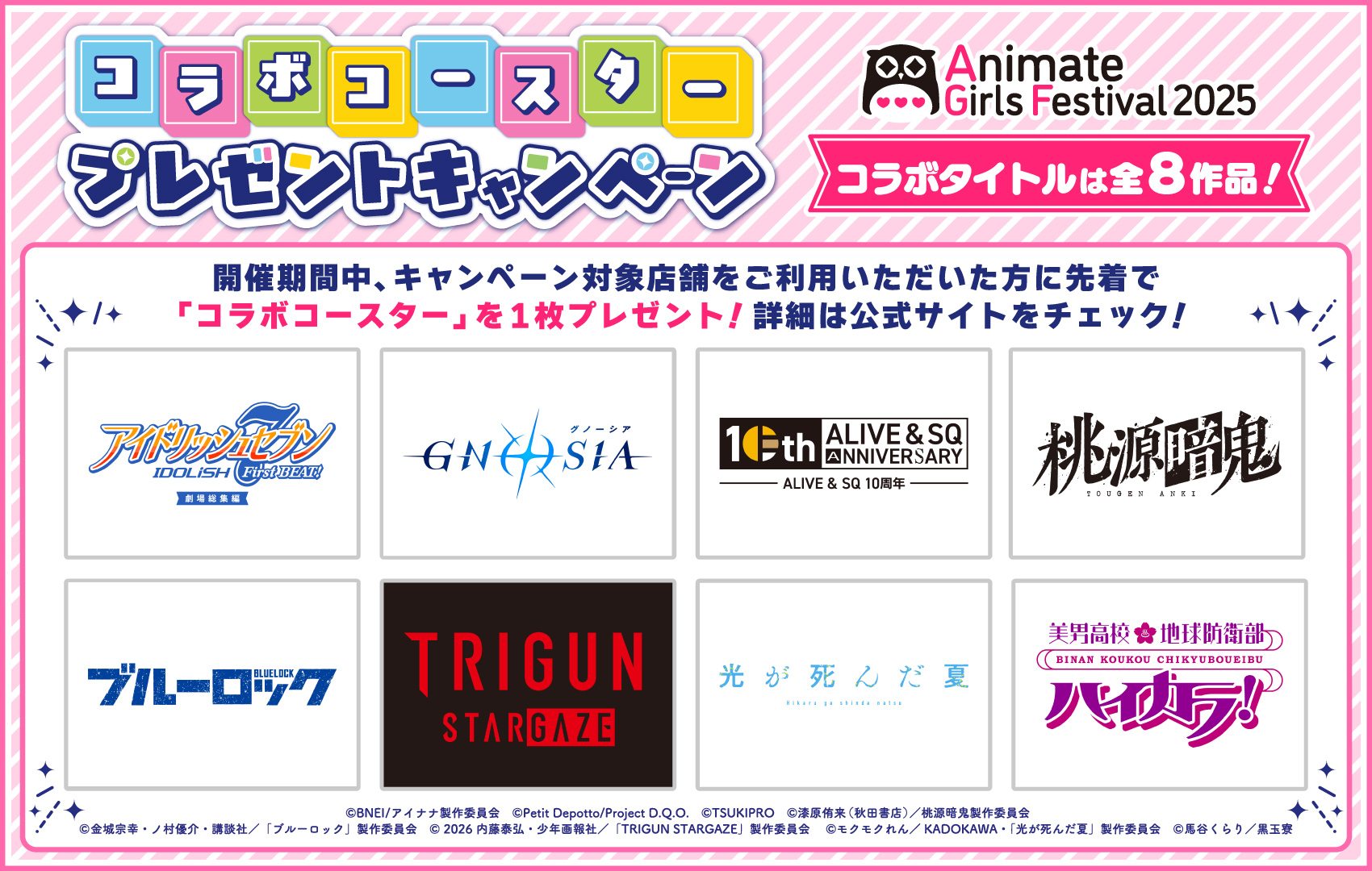 (C)SAOTOME GAKUEN Illust.KOGADO STUDIO (C)ANYCOLOR, Inc. (C)BNEI/アイナナ製作委員会 (C)Petit Depotto/Project D.Q.O. (C)TSUKIPRO (C)漆原侑来(秋田書店)/桃源暗鬼製作委員会 (C)金城宗幸・ノ村優介・講談社/「ブルーロック」製作委員会 (C) 2026 内藤泰弘・少年画報社/「TRIGUN STARGAZE」製作委員会 (C)モクモクれん/KADOKAWA・「光が死んだ夏」製作委員会 (C)馬谷くらり/黒玉寮 (C)AGF2025