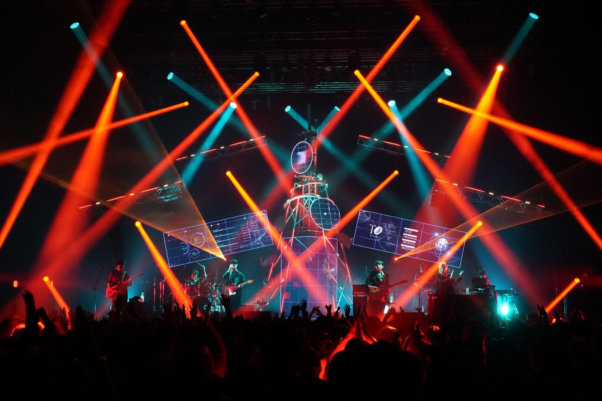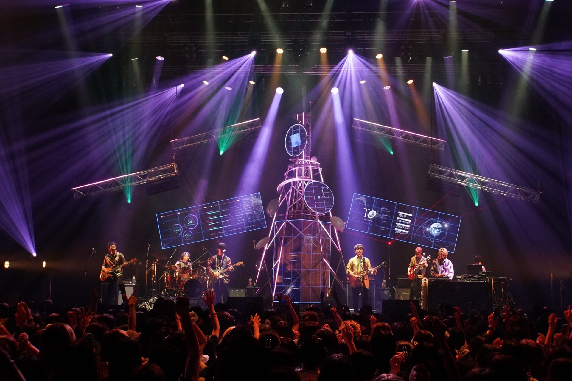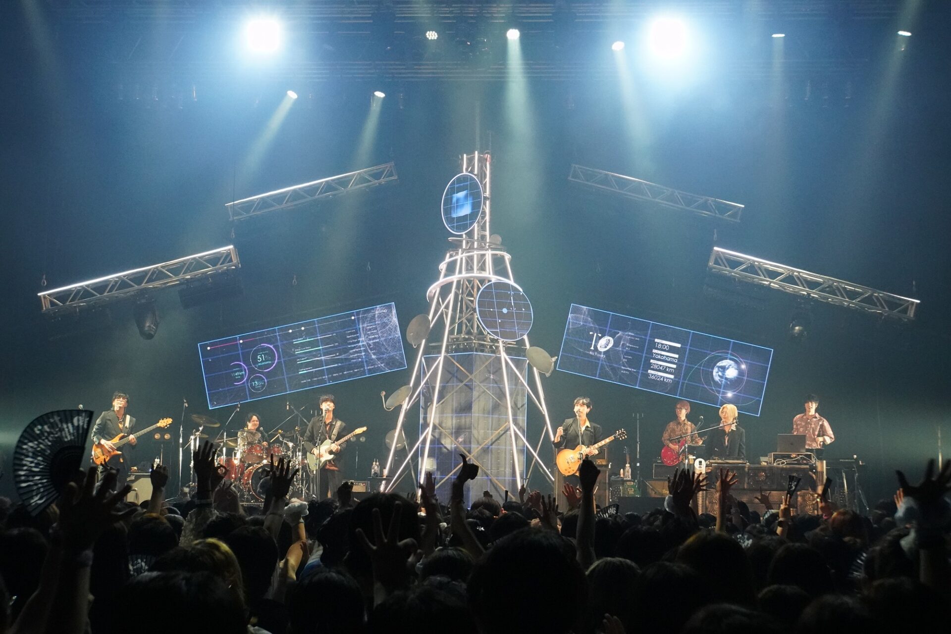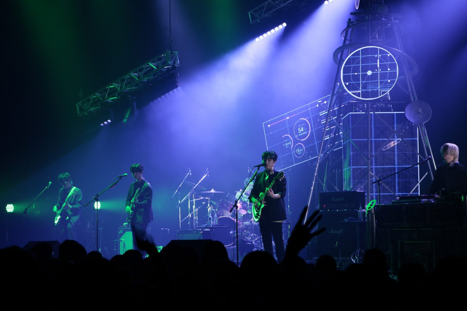 開場時にまず多くのファンが注目したのは、ステージ中央にそびえ立つ塔のようなオブジェだ。まるでホールやアリーナでのワンマンライブのようなSir Vanityらしい遊び心が感じられる壮大なセットに、開演を待つファンの期待値も高まっていく。Sir Vanityのライブは、毎回セットのデザインやライブの構成で、タイトルやコンセプトの世界観を体現しているところが大きな特徴。強烈なインパクトを与えた今回の塔のオブジェは、Sir Vanityの5年間の活動が交差し、時間や空間を超えて繋がる基地局を表現しており、集まったファンの思いを電波として吸収し、新たな世界線を生み出していく…。今回の“TO”はそんなメッセージも含んだライブとなっていた。レーザーに照らされる中、近未来感溢れるOvertureが流れ出し、10からのカウントダウンが始まるとメンバーが順番に登場。大きな歓声が上がると、舞台『東京リベンジャーズ-血のハロウィン編-』の主題歌「will」でライブはスタートした。1曲目からヘヴィーでドラマチックなバンドサウンドに乗せて、梅原と中島のツインボーカルが響き渡り、派手な照明やレーザーの演出も相まって、一気にライブという非日常空間へと誘っていく。続いて、照明が赤に切り替わるとピアノイントロが印象的な「New Day」へ。さらに、イントロで渡辺が「横浜、騒いでいこうぜ!」と煽りながら、2020年6月リリースの1stシングル「Vanity」へと続く。Sir Vanityにとっての始まりの1曲であり、決意表明とも取れるようなバンドのテーマ曲的なナンバーだ。人気曲を一気に3曲畳みかけ、Sir Vanity最大の魅力である骨太なバンドサウンドとツインボーカル全開の幕開けとなった。