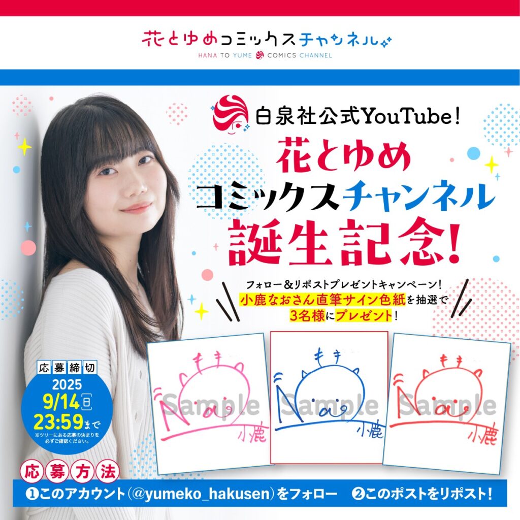 さらに、「花とゆめコミックスチャンネル/HANA TO YUME COMICS【公式】」の誕生を記念して、白泉社の少女まんが公式X「ゆめ子@花とゆめコミックス【公式】(@yumeko_hakusen)」で小鹿なおさんの直筆サイン入り色紙が抽選で3名に当たるキャンペーンも開催中です。