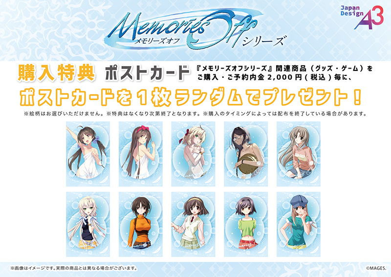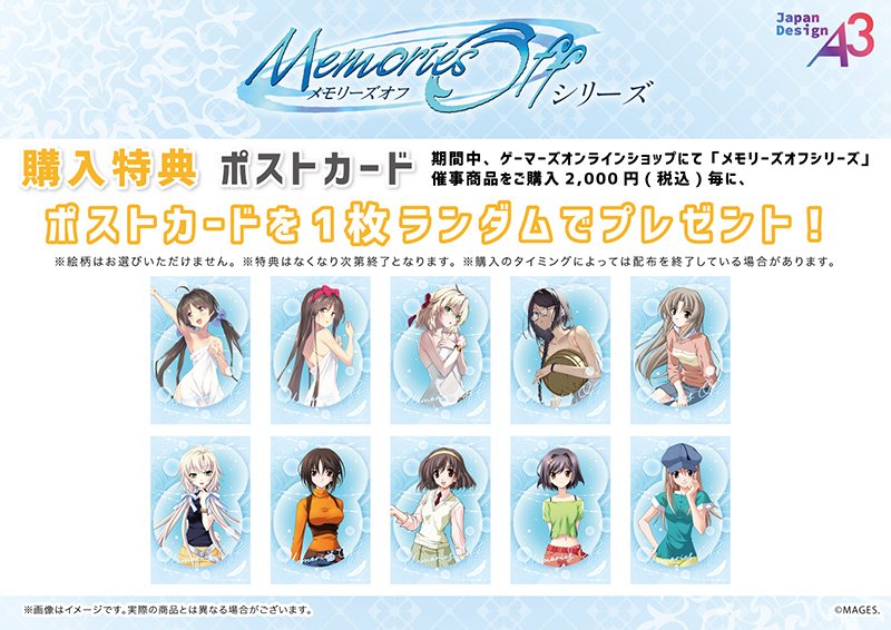 期間中、ゲーマーズオンラインショップにて「メモリーズオフシリーズ」催事商品をご購入2,000円(税込)ごとに、特典ポストカード(全10種)をランダムで1枚プレゼント!