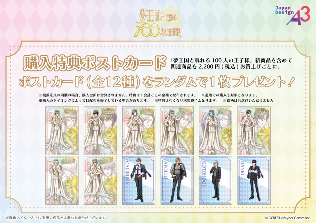 『夢王国と眠れる100人の王子様』新商品を含めて関連商品を1会計2,200円(税込)お買い上げごとに、購入特典としてポストカード(全12種)をランダムで1枚プレゼント。