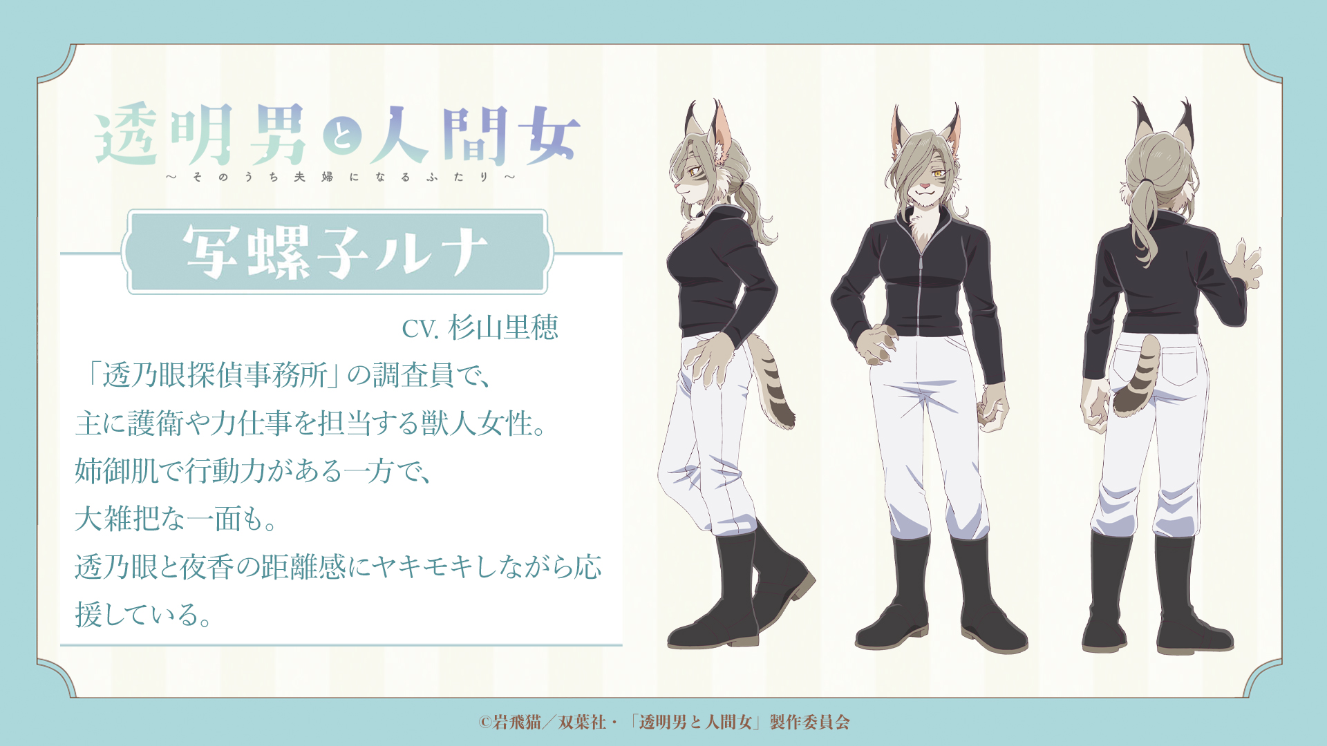「透乃眼探偵事務所」の調査員で姉御肌な獣人女性・写螺子ルナ役を杉山里穂さんが、ぶっきらぼうに見えて実はマメな人間男性・鬼木羅だいち役を福西勝也さんが演じることが明らかになりました!