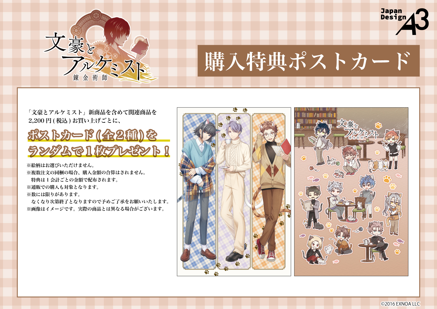 『文豪とアルケミスト』の新作グッズを含む関連商品を1会計2,200円(税込)お買い上げごとに、ポストカード(全2種)をランダムで1枚プレゼントします!