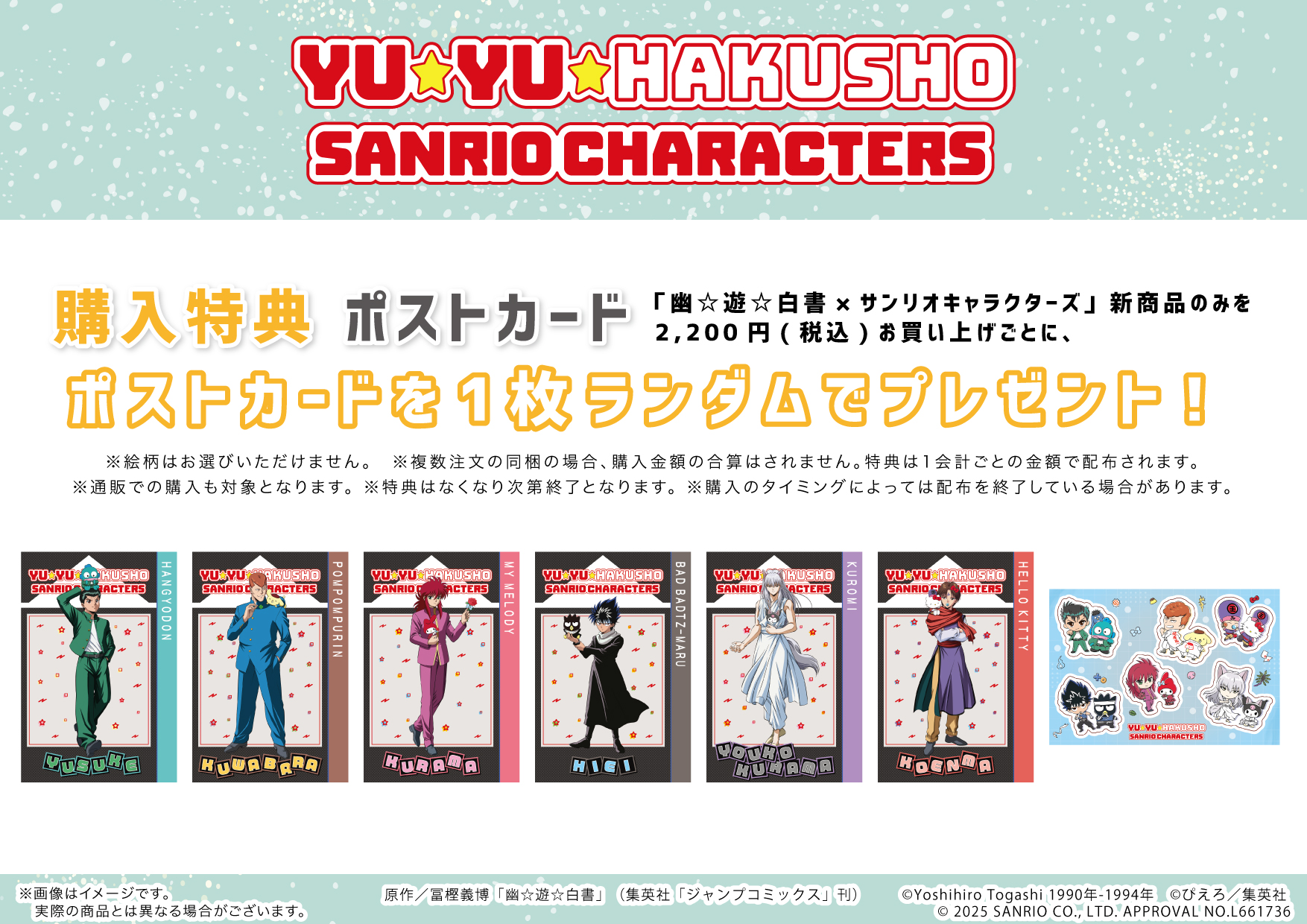 今回登場したTVアニメ『幽☆遊☆白書』×サンリオキャラクターズの新作コラボグッズを2,200円(税込)お買い上げごとに、ポストカード(全7種)をランダムで1枚プレゼントします。