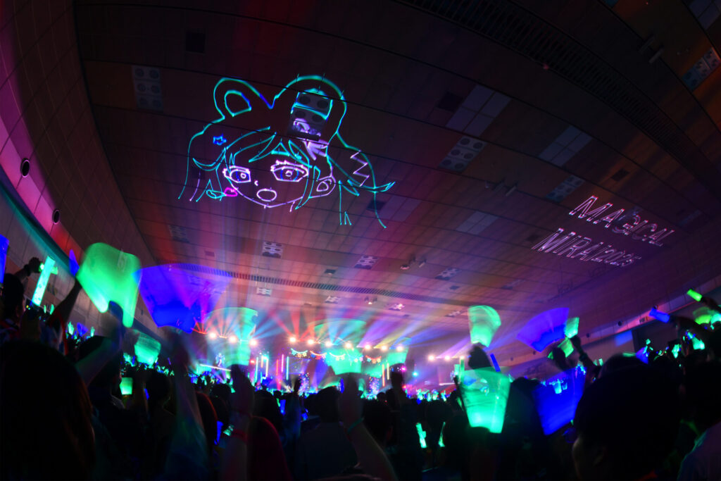 初音ミクが「ラストラス」を力強く歌い上げる中、実はOSAKAとTOKYOの会場の天井には空に輝く星座のように初音ミクとイベント名が映し出される特殊な演出も。会場には初音ミクをイメージしたブルーグリーンと、今年のメインビジュアルを連想させるブルーの光が満ち、初音ミクとファンが一緒に「輝いて!」とコールするシーンもありました。