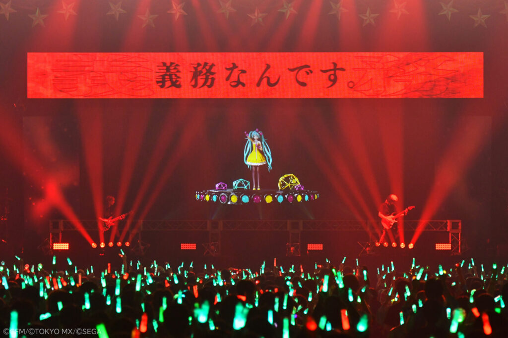 その一方で、予告をしないままセットリストに盛り込まれている初披露曲もあり、全公演共通の曲として3曲目に初披露された「こちら、幸福安心委員会です。」(うたたP feat. 初音ミク)では、会場が面白いほどのどよめきに包まれる瞬間も。「まさかこの曲が!?」というざわめきの中でイントロが始まりましたが、いざ歌が始まるとペンライトの色もコール&レスポンスも驚くほど揃うという盛り上がりを見せました。