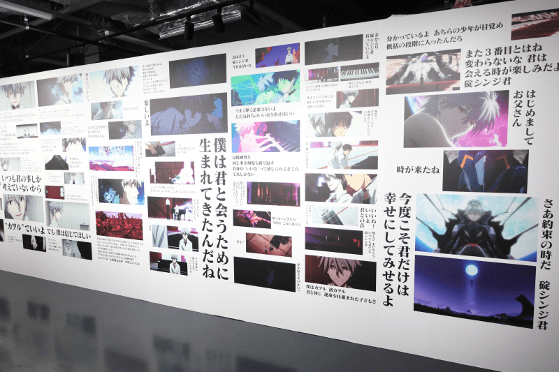 会場の左右の壁面には、『新世紀エヴァンゲリオン』『ヱヴァンゲリヲン新劇場版』双方の場面写真がズラリ。名セリフとともに展示された資料は、絵のタッチや表情の機微から制作の熱量が伝わってきます!