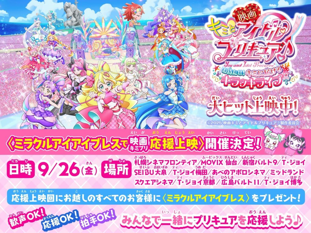 9月26日(金)に、札幌シネマフロンティア/MOVIX仙台/新宿バルト9/T・ジョイSEIBU大泉/T・ジョイ梅田/あべのアポロシネマ/ミッドランドスクエアシネマ/T・ジョイ京都/広島バルト11/T・ジョイ博多の全国10劇場で「ミラクルアイアイブレスで映画キミプリ応援上映」の実施が決定。