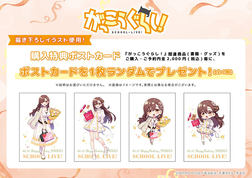 期間中に会場内にて、『がっこうぐらし!』関連商品(書籍・グッズ)をご購入・ご予約内金2,000円(税込)毎に、特典ポストカード(全4種)を1枚ランダムでプレゼント!
