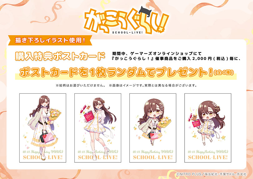 期間中、ゲーマーズオンラインショップにて『がっこうぐらし!』催事商品をご購入2,000円(税込)毎に、特典ポストカード(全4種)をランダムで1枚プレゼント!