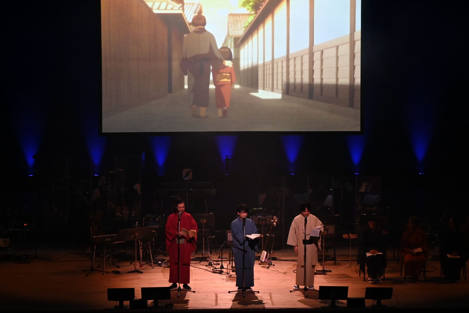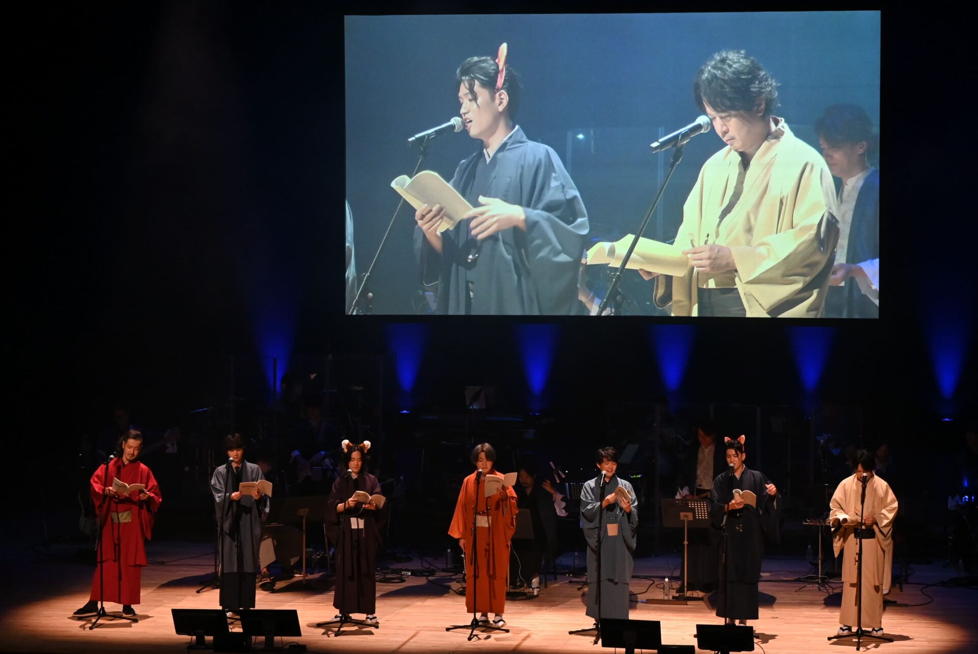 イベント冒頭で披露されたのは、この日のためだけに書き下ろされたオリジナル脚本による朗読劇「青ざめたミブロ」。京の街から大阪へ向かうミブロの7人が珍道中を繰り広げ、最後にはキツネに化かされてしまう、という展開。阿座上、小野、竹内、杉田らがキツネ耳、ネコ耳を付けて芝居をする一幕も。キャスト陣による渾身の芝居と、生演奏が重なってアニメ本編とは一味違ったミブロワールドが展開された。生演奏をした林は「朗読劇での裏での生演奏、ドキドキしました!」とコメント。