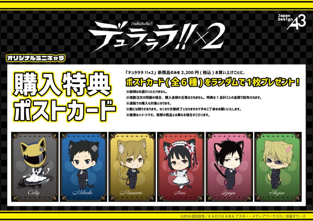 また、TVアニメ『デュラララ!!×2』の新商品を2,200円(税込)お買い上げごとにポストカード(全6種)をランダムで1枚プレゼント♪