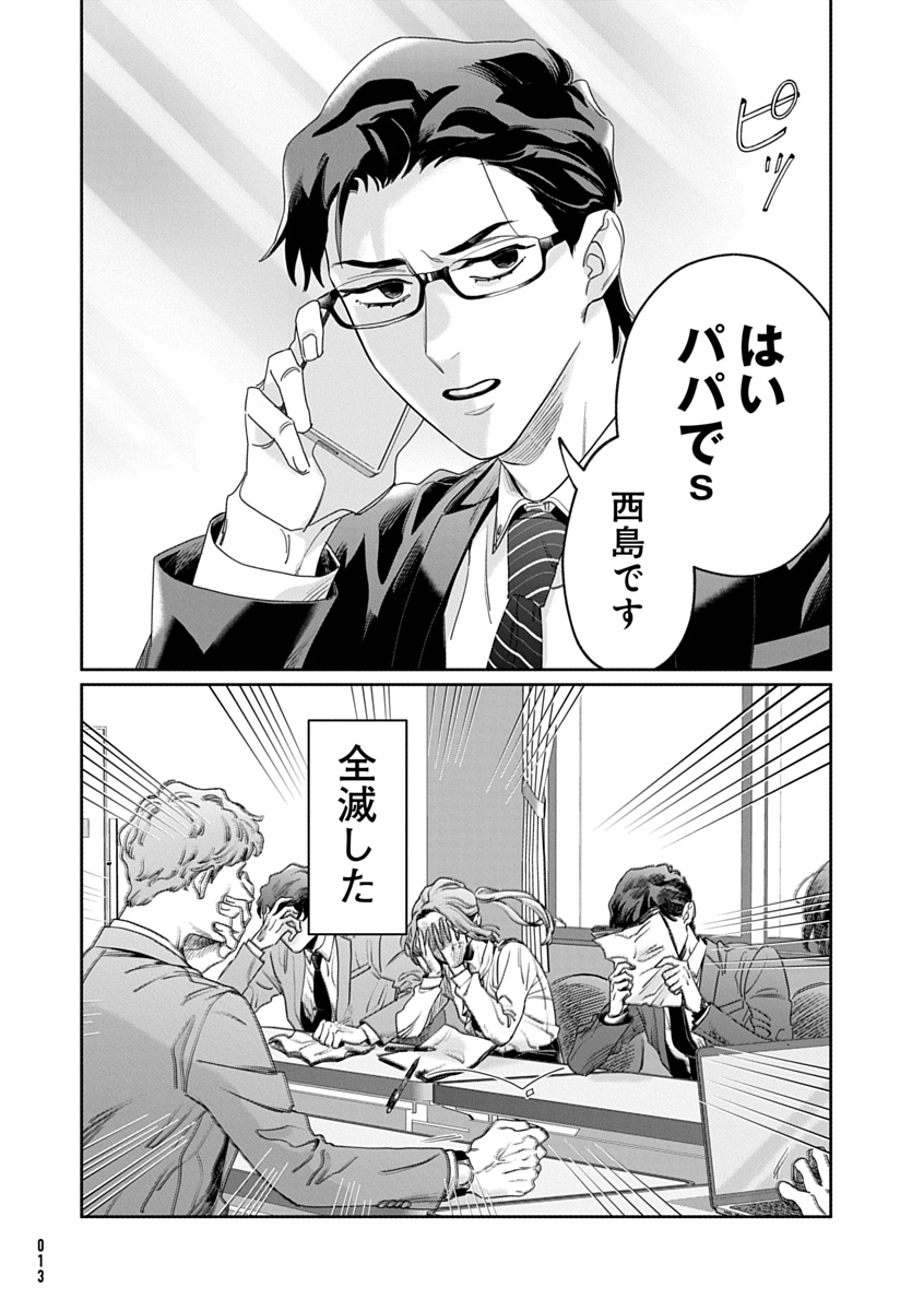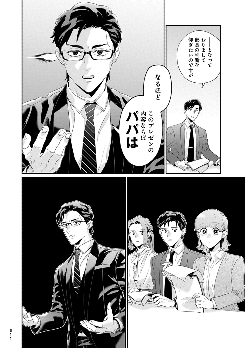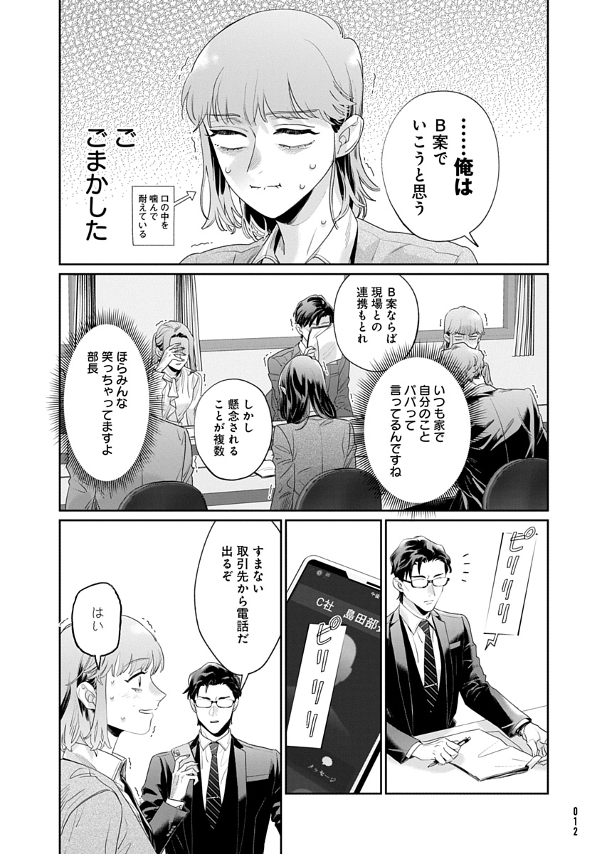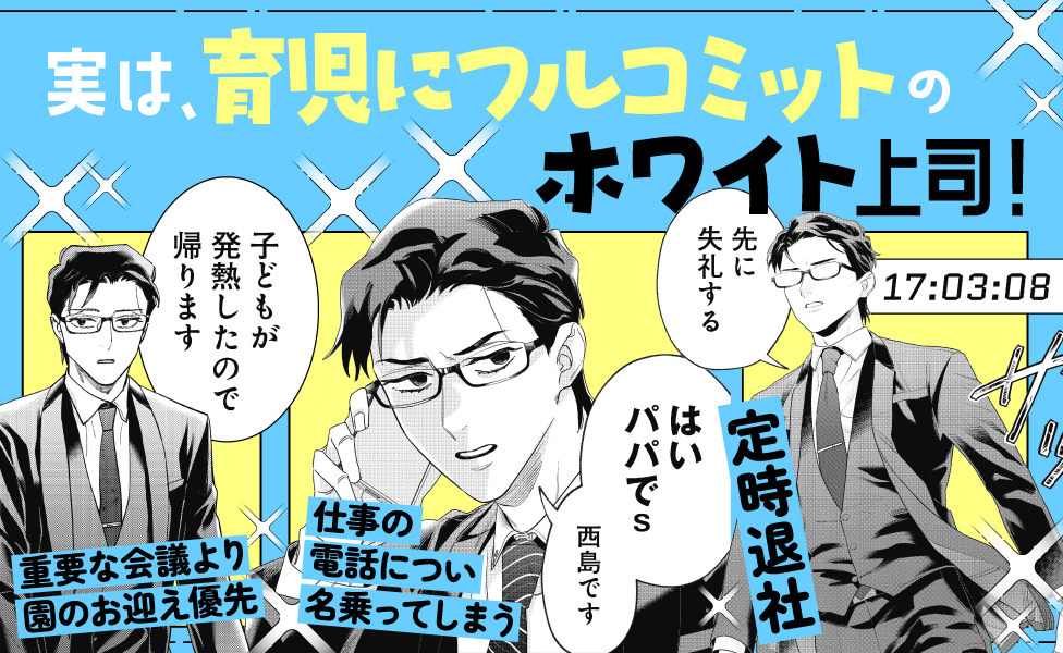 本作は、そんなコワモテ部長・西島と、部下たちが織りなすワークライフバランスコメディ作品です。得意先の電話に思わず「もしもしパパで…」と名乗ったり、重要な会議の時に限って保育園からの呼び出しがあったりと、「会社✕育児あるある」に共感必至! みんなで楽しくLet’s働き方改革!!