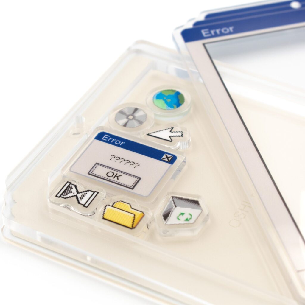 あの頃のPCウィンドウをイメージしたレトロかわいいアクリルフレーム。ドット絵な雰囲気が、ゲーム・Vtuberなどデジタル、インターネットなイメージの推しがいるオタクにおすすめ!