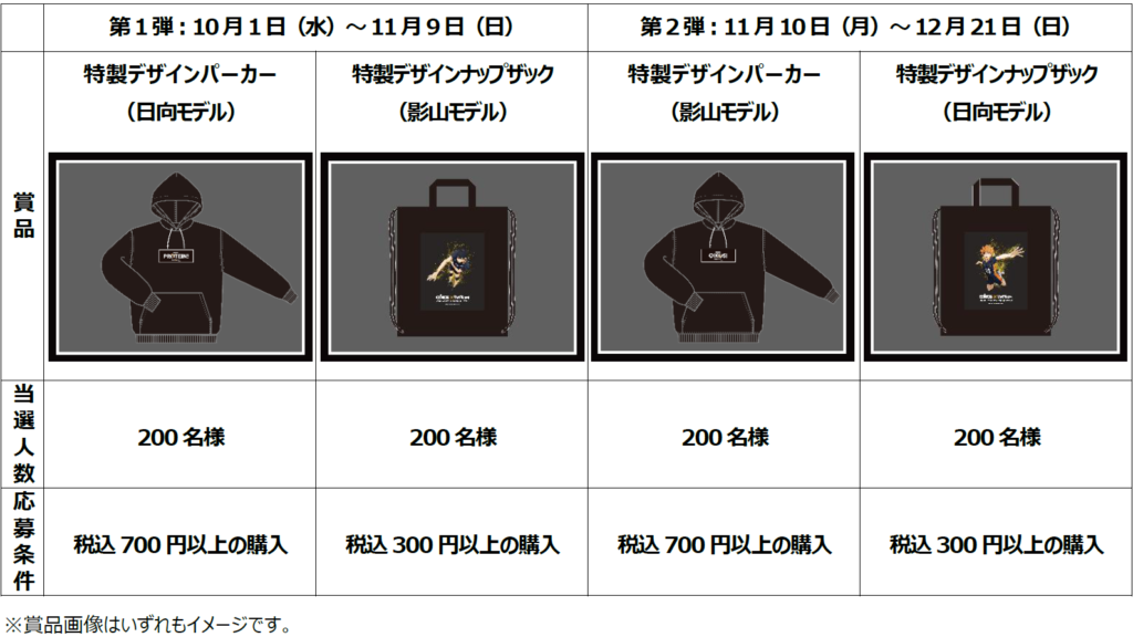 対象商品の購入レシートで応募すると、抽選で「ダノン オイコス」×「ハイキュー!!」特製デザインのパーカーやナップザックが当たります。購入金額に応じて応募できる賞品が変わるので、お目当てのアイテムを狙うことができます。