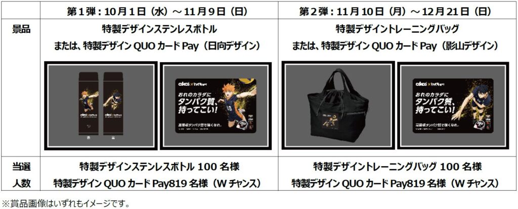 コラボキャンペーンでは、限定オリジナルグッズが抽選で当たる2種類のプレゼントキャンペーンが行われるほか、作品のメインキャラクターである日向翔陽・影山飛雄の新録ボイスが収録されたオリジナルWEB動画「おれのカラダにタンパク質、持ってこい!」篇の公開も。