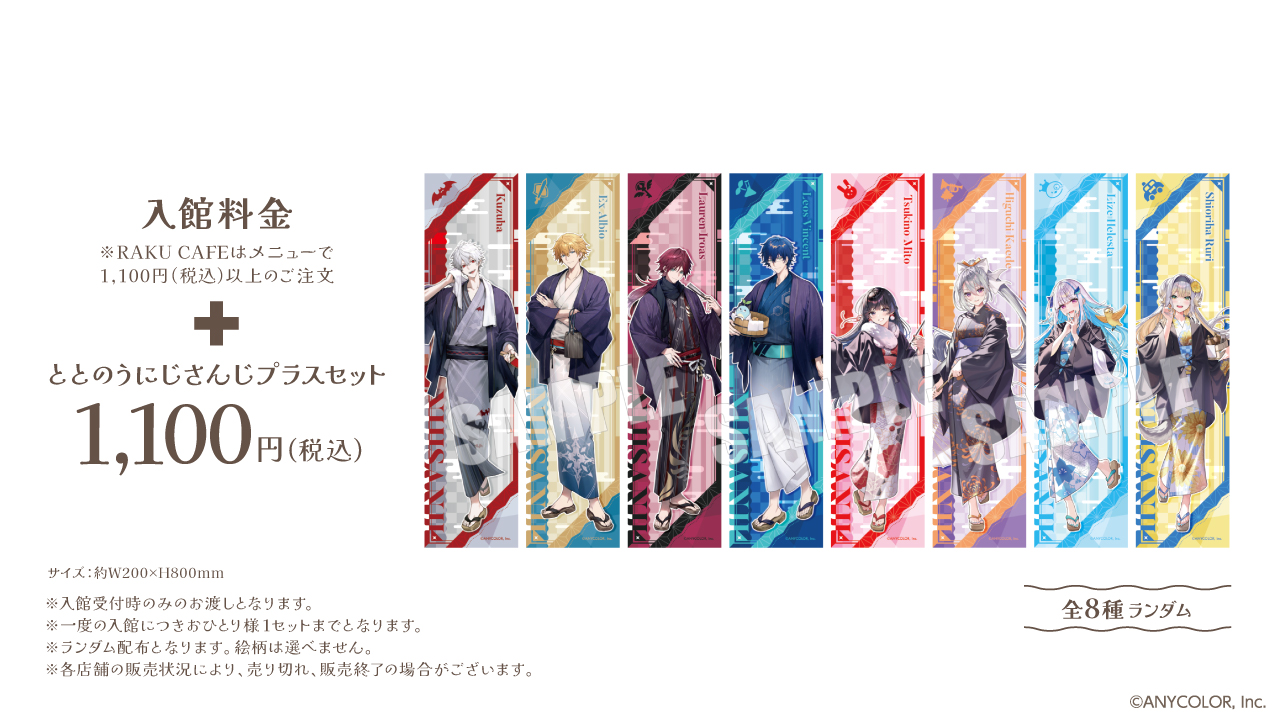 また、入館時に入館料金&ととのうにじさんじプラスセットを購入すると撮り下ろしイラストを使用したコラボ限定のマフラータオルがランダム配布されるので、この機会にぜひゲットしましょう!