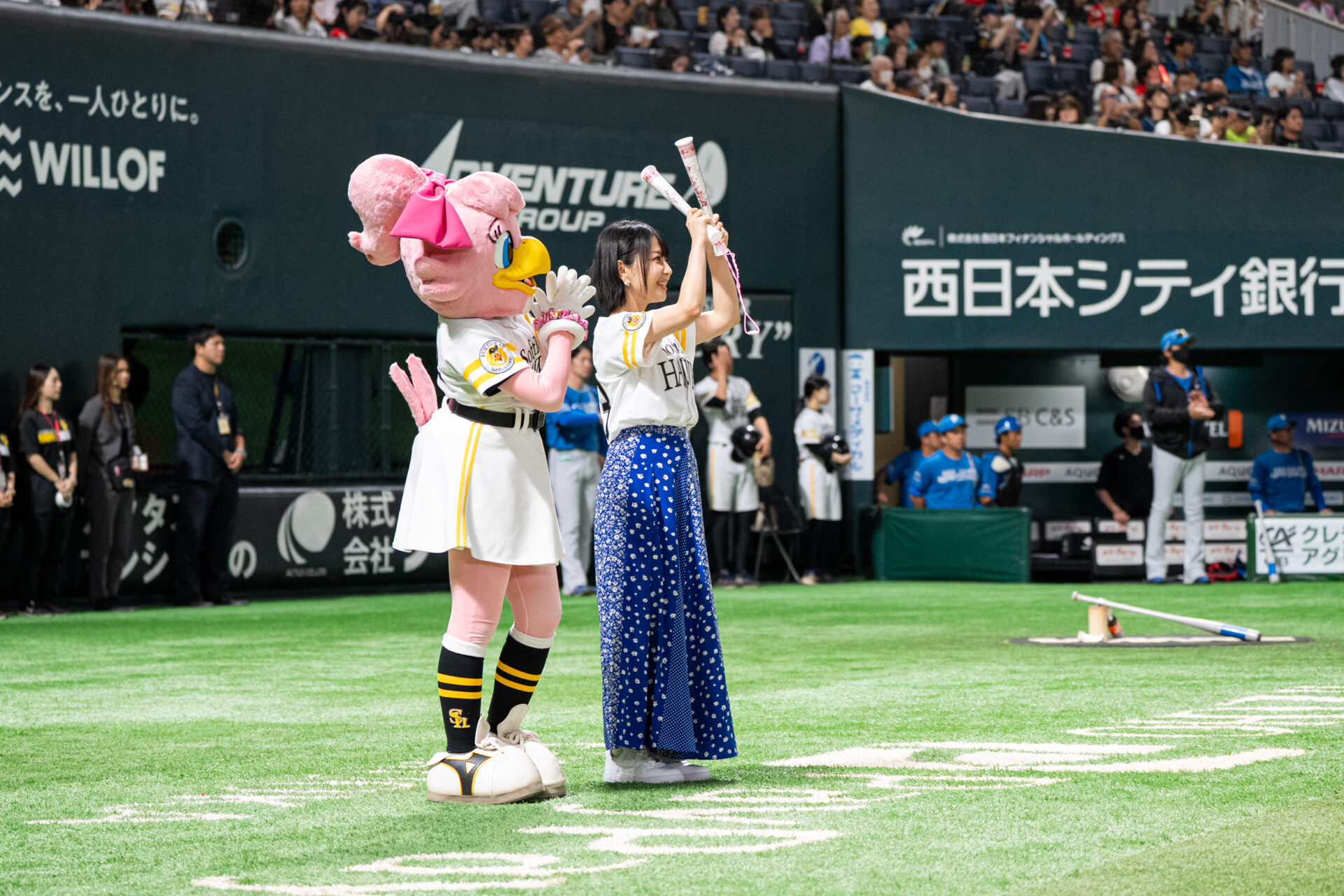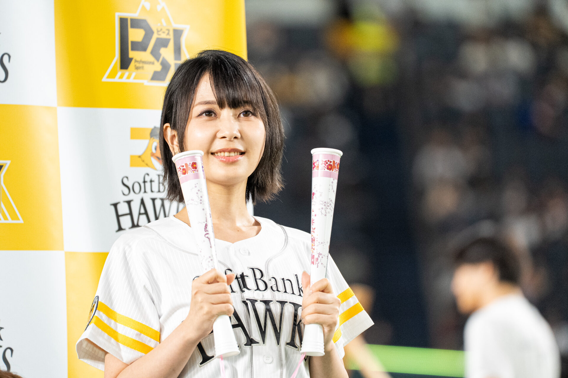 ついに迎えた始球式では、田野と種田がそれぞれの役柄にちなんだ2と3の背番号を背負ったユニフォームで大歓声の中登場しました。そして、試合開始前には田野がスターティングメンバーを発表!「九州から全国制覇! 気合い入れていくぞ! よろしくぅ!」とスタジアムにサキが降臨したようにスタメン発表を締めくくると会場は大きな熱気に包まれました。PRタイムで種田は作品の魅力について、「劇場版になってさらにパワーアップしてみなさんのもとにお届けすることができます! 笑いあり、涙あり、そしてライブ映像ありの盛りだくさんの映画となっております!」と熱く語りました。田野は始球式の意気込みについて聞かれると、「ホークスの勝利、そして映画の大ヒットを込めまして投げさせていただきます! 佐賀へ届けー!」とやる気がみなぎる様子でコメント。そして、マウントに入った田野は、キャッチャーの後ろで応援する種田が見守る中、大きく振りかぶり見事なピッチングを披露! 投げ終わった後は両手を挙げながら、キャッチャーまで笑顔で走り抜けました。スタジアムからの喝采を浴び、まさに九州から全国制覇の先駆けとなる大舞台となりました。