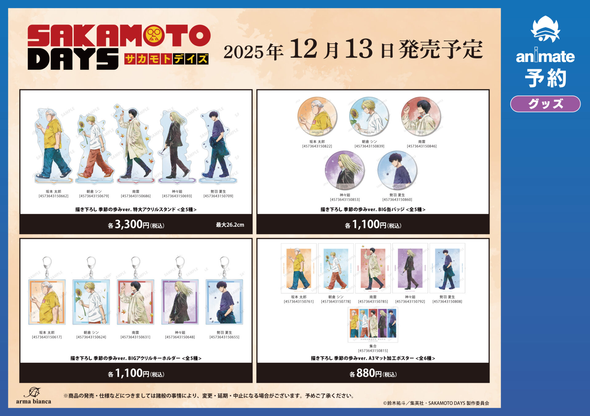 2025年12月13日(土)~12月28日(日)のイベント開催期間中、全国アニメイト、アニメイト通販にてTVアニメ『SAKAMOTO DAYS』関連のキャラクターグッズを購入1,100円(税込)毎に、フェア購入特典「ブロマイド(全6種)」が1枚プレゼントされます。