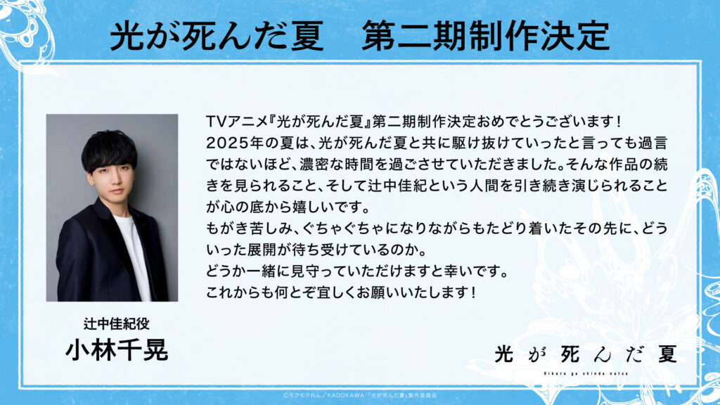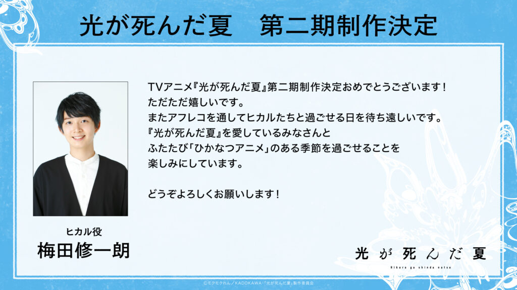 『光が死んだ夏』を愛しているみなさんとふたたび「ひかなつアニメ」のある季節を過ごせることを楽しみにしています。