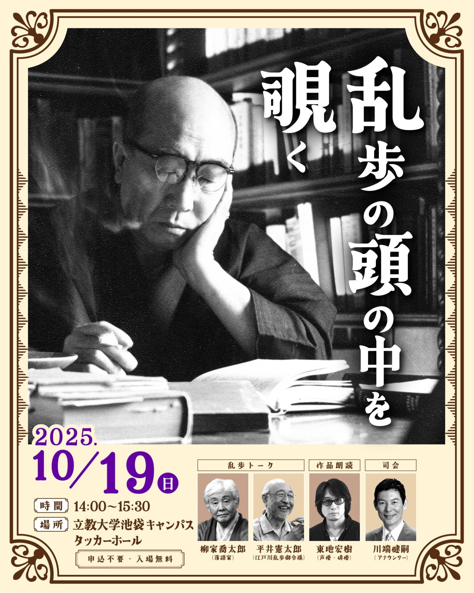 2025年10月11日(土)~11月3日(月・祝)に立教大学などで、江戸川乱歩の生誕月にあわせたイベント『としま!乱歩祭』が開催されることが明らかになりました。
