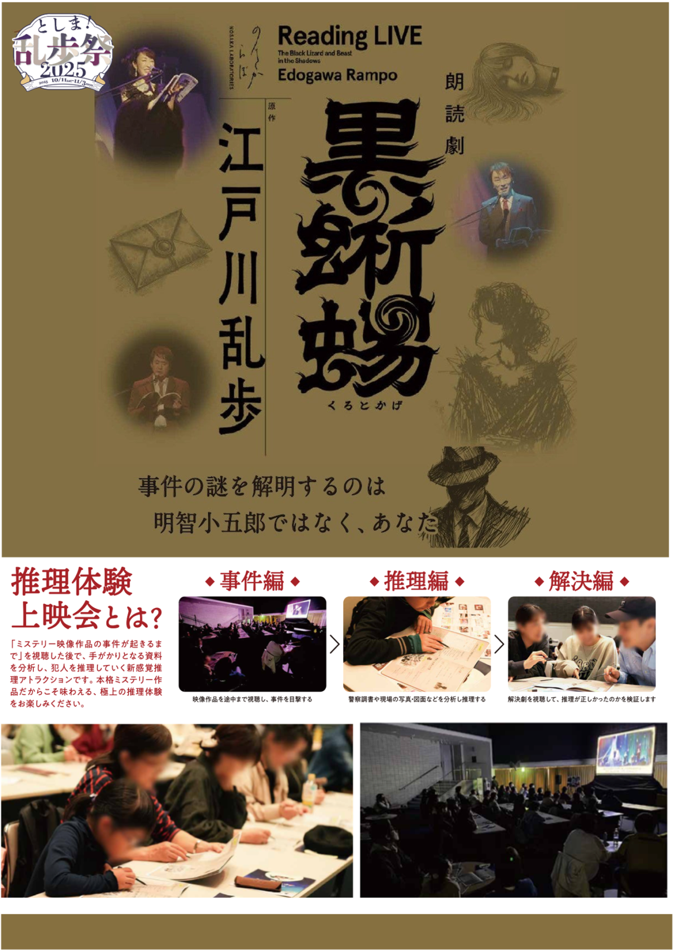 同イベントでは、立教大学で柳家喬太郎氏×平井憲太郎氏の乱歩トークや声優・東地宏樹さんによる作品朗読などが行われるほか、東武百貨店 池袋本店と池袋西口エリアで体験型ミステリーやウォーキングアトラクションが開かれる予定です。