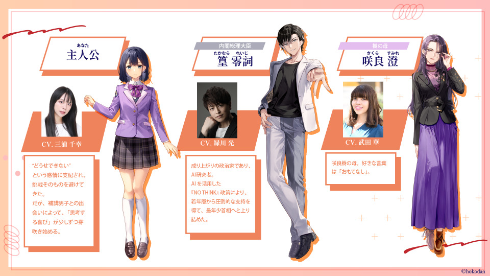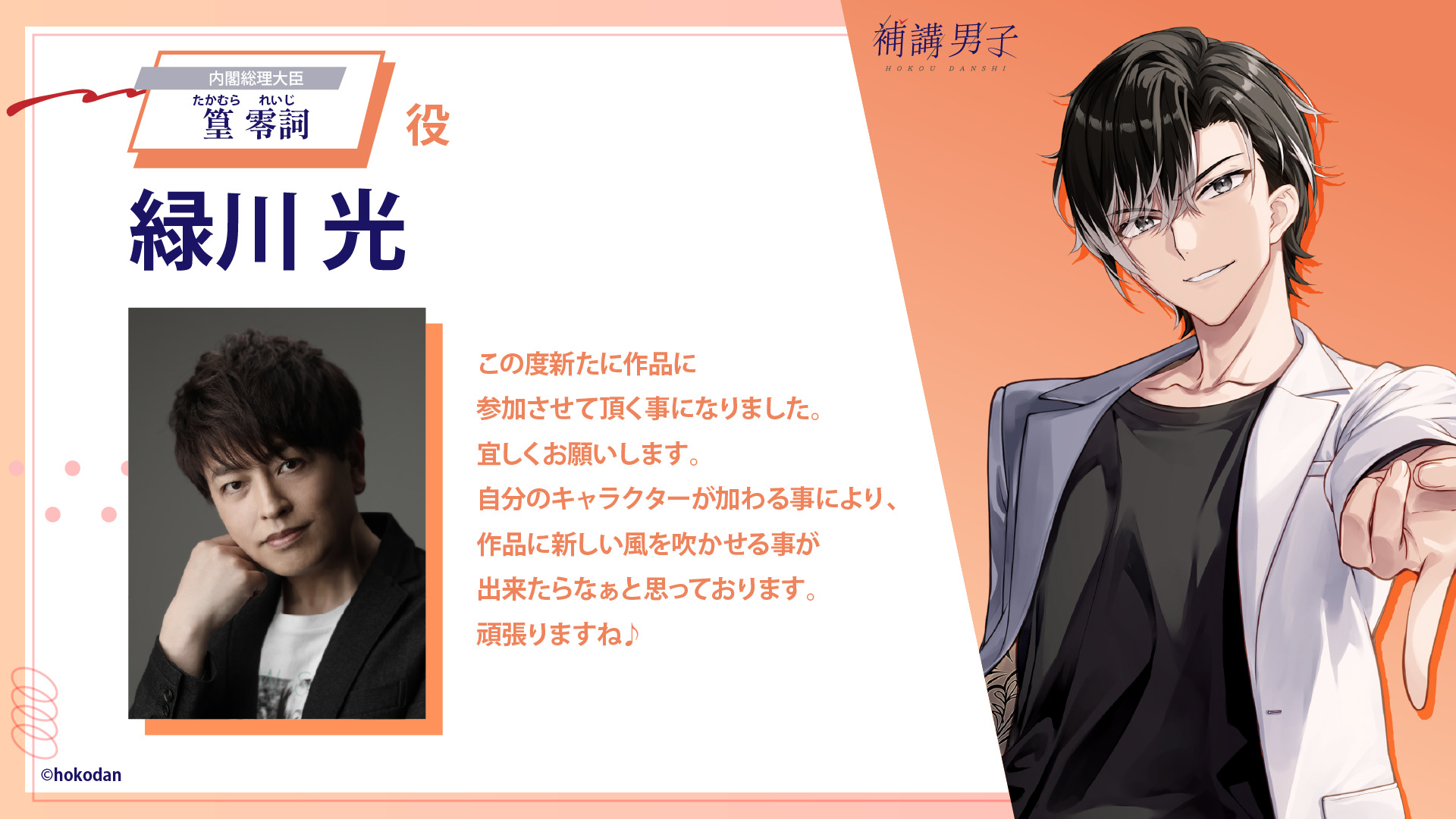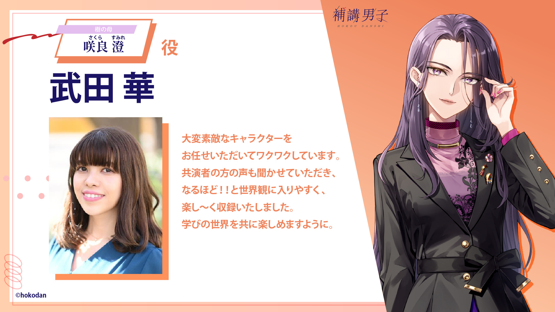 2025年11月12日(水)発売の「『補講男子』3rdドラマCD ~Memory 3~」に初登場となる新キャラクター3名が発表されました! 主人公を三浦千幸さん、内閣総理大臣・篁零詞(たかむら れいじ)を緑川光さん、樹の母・咲良澄(さくら すみれ)を武田華さんが演じます。
