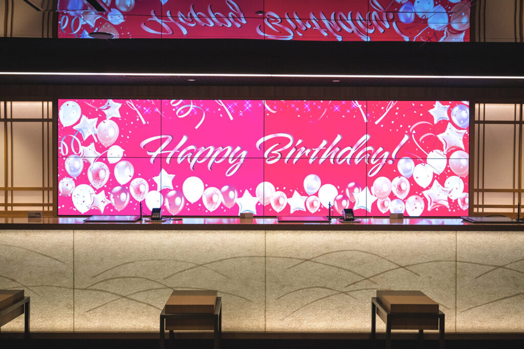 ☆5:00P.M./特大サイネージで推し色メッセージ。フロントの大画面サイネージで推しへのメッセージを掲出。“大切な気持ちをかたちにする”特別な時間。