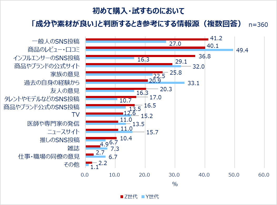 Z世代は「一般人のSNS投稿(41.2%)」「インフルエンサーのSNS投稿(36.8%)」と回答した人が目立ち、やはりSNSをよくチェックしていることがうかがえます。「商品のレビュー・口コミ(Z世代:40.1%、Y世代:49.4%)」は、Z世代・Y世代共に比較的多くの人が活用していると分かりました。Y世代は「過去の自身の経験から(33.1%)」と回答した人も3割以上いました。