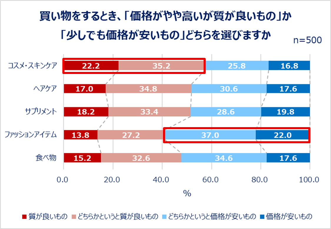 質を求めるとき、比例して高くなりやすい「価格」。見た目や味には差がないとき、「価格がやや高いが質が良いもの」か「少しでも価格が安いもの」どちらを選ぶか聞いてみたところ、およそ半々という結果に。カテゴリとしては「コスメ・スキンケア」は質の良さを取る人が、「ファッションアイテム」は価格の安さを取る人がやや多いようです。