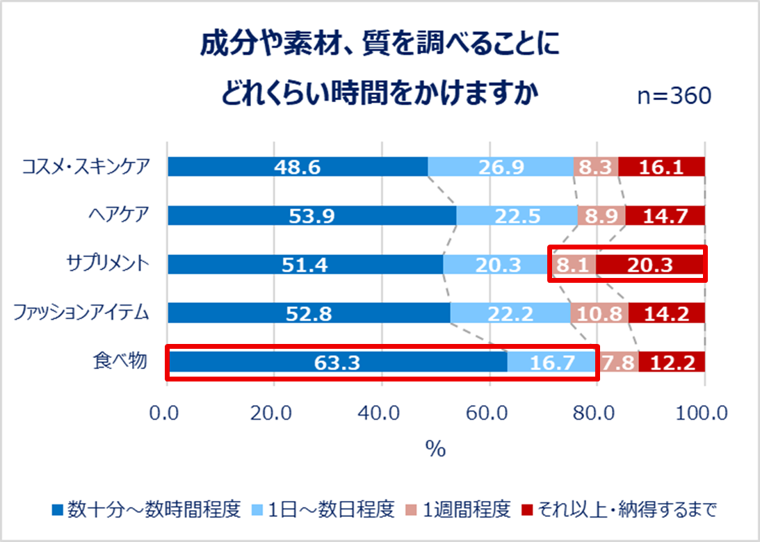 成分や素材、質を調べることにどれくらい時間をかけているかも商品カテゴリ別で聞いたところ、約半数が数十分~数時間程度と、その日のうちに検討を終えていることが分かりました。時間をかけている人が比較的多いのは「サプリメント」、少ないのは「食べ物」でした。